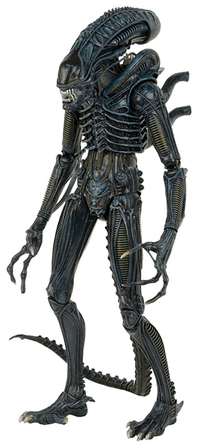 The menacing Warrior stands over 22” tall, and has a hinged jaw that opens, revealing an inner mouth that extends for realistic movie action. It has almost 30 points of articulation, including double knee joints and a bendable tail, and is movie-accurate, down to the bluish tint that actually came from the lighting used in the film to heighten the cold, alien nature of these creatures.