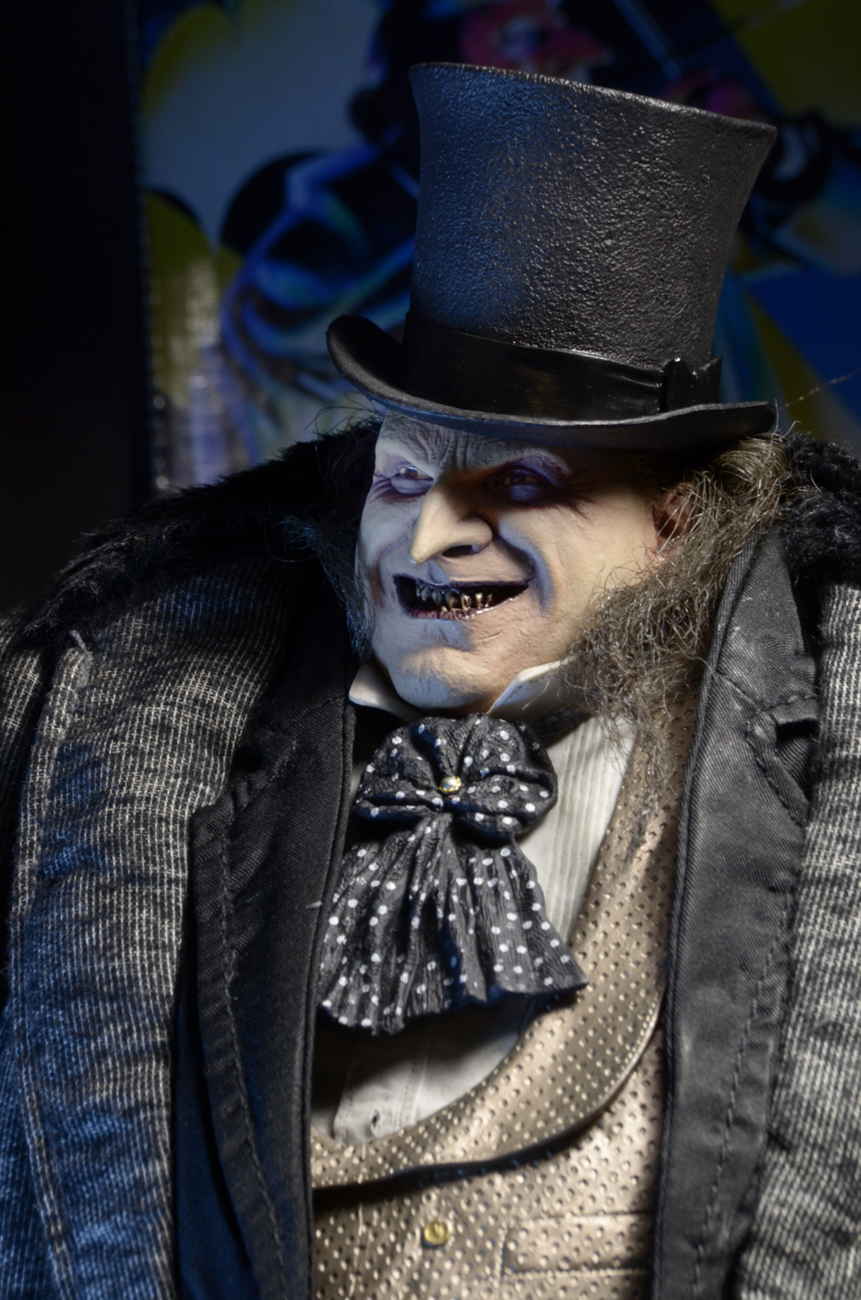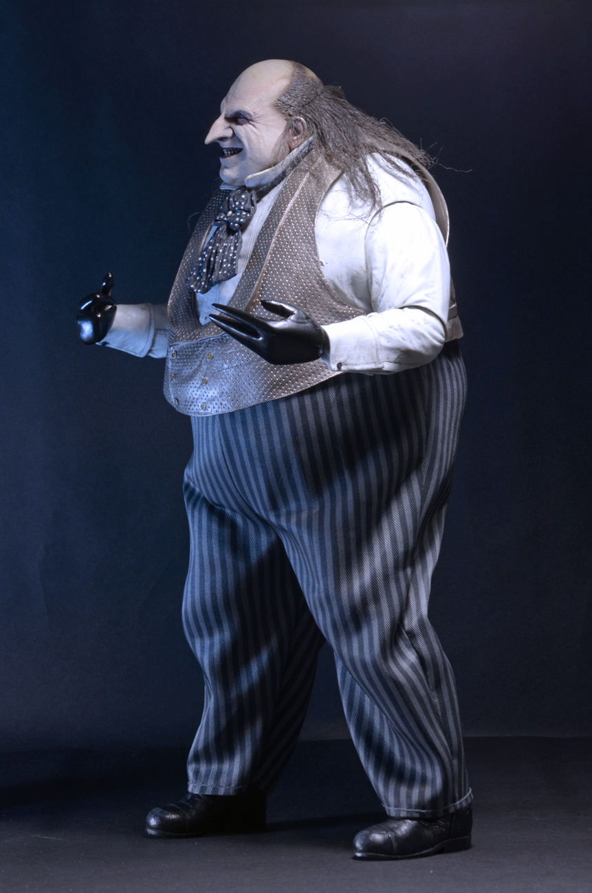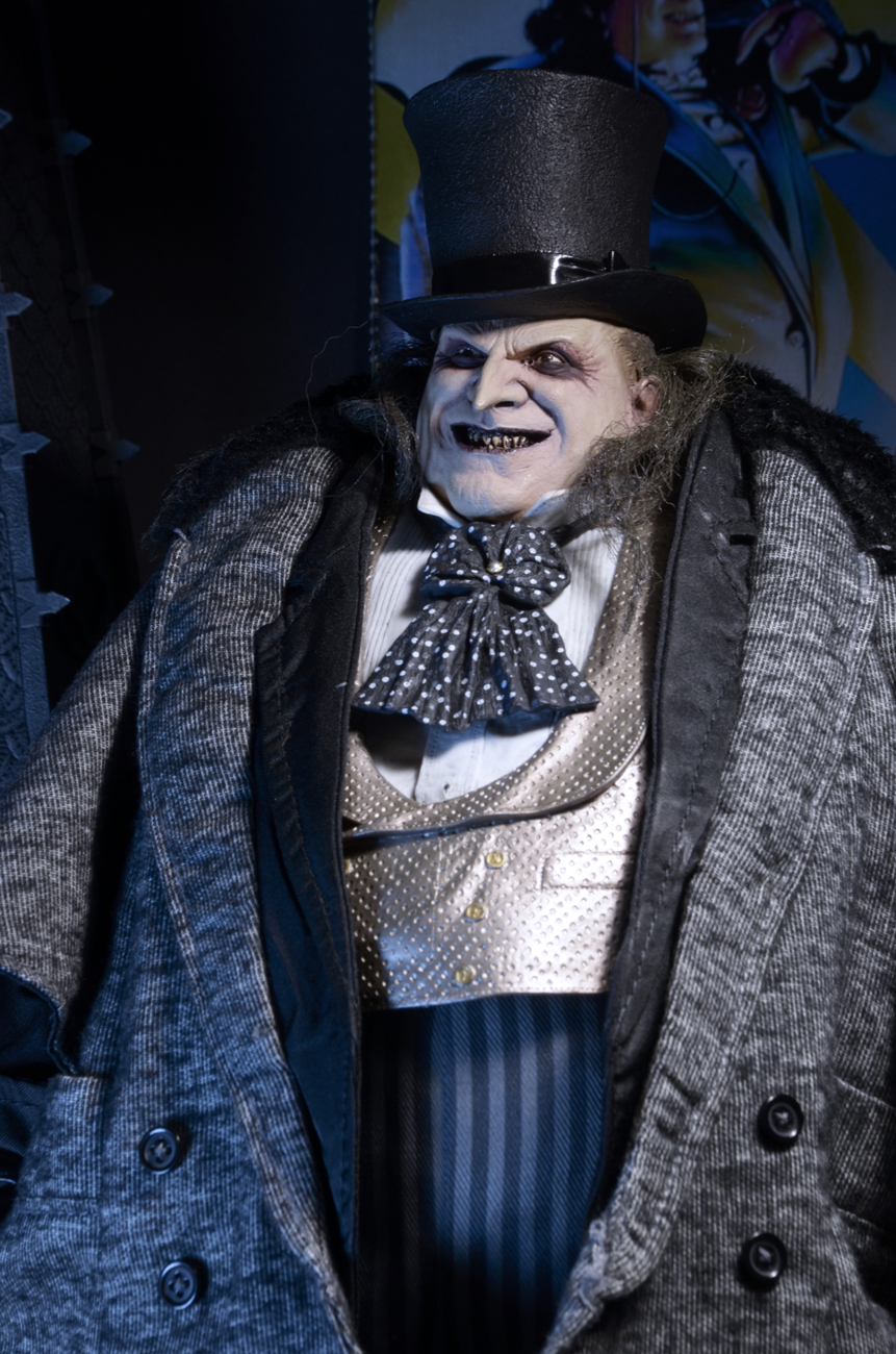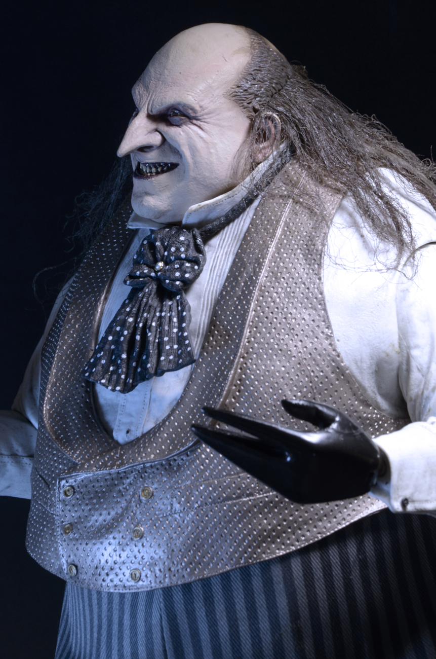 The 1/4 scale action figure features the likeness of actor Danny DeVito, whose memorable performance as the twisted Oswald Cobblepot in the 1992 movie still defines the character. The fully poseable figure stands 15″ tall and features synthetic hair and a movie-authentic sculpt. Penguin comes with an all-new removable fabric coat, removable top hat, “Cobblepot for Mayor” mini-poster, monocle, cigarette in holder and half-eaten fish accessories.