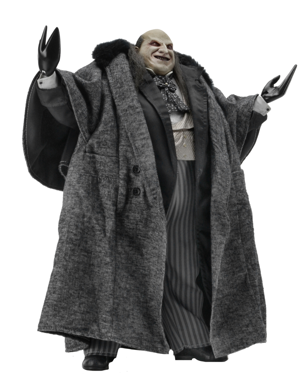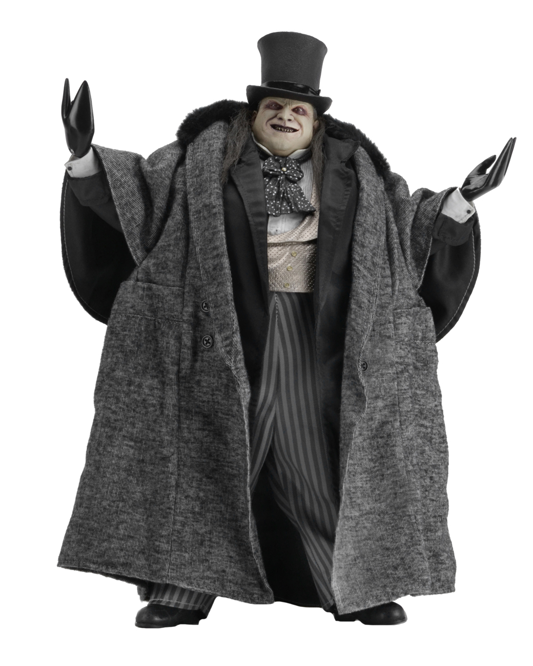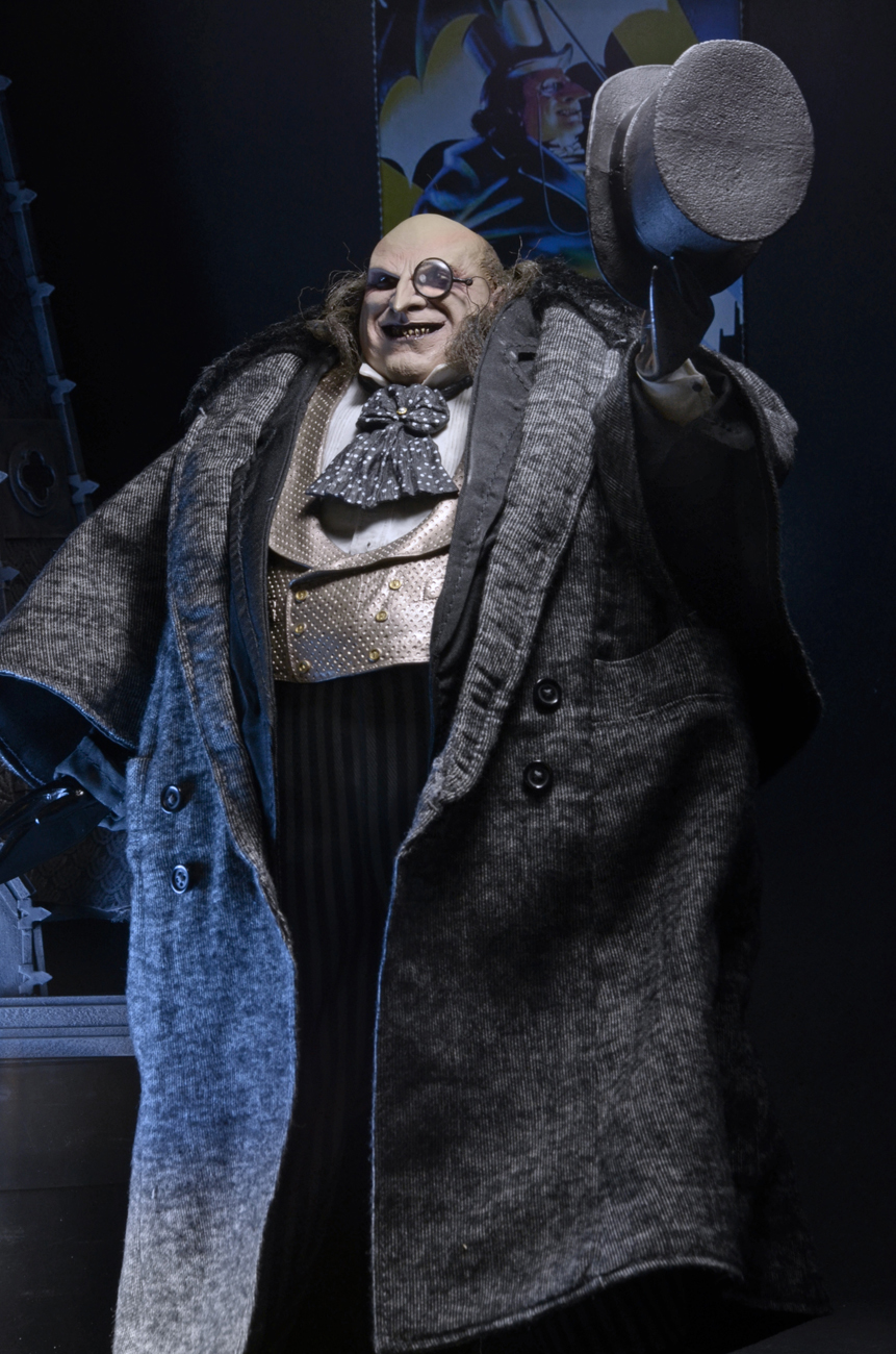 The 1/4 scale action figure features the likeness of actor Danny DeVito, whose memorable performance as the twisted Oswald Cobblepot in the 1992 movie still defines the character. The fully poseable figure stands 15″ tall and features synthetic hair and a movie-authentic sculpt. Penguin comes with an all-new removable fabric coat, removable top hat, “Cobblepot for Mayor” mini-poster, monocle, cigarette in holder and half-eaten fish accessories.