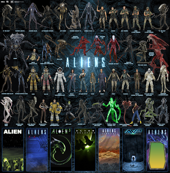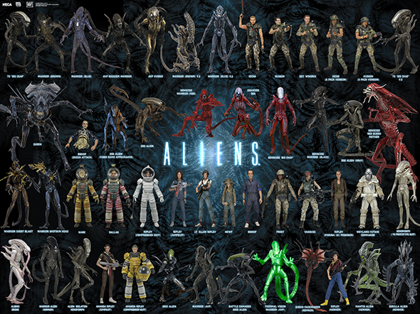 We’ve updated two different versions of our Aliens action figure visual guide to be completely current! Both include all our Aliens action figures to date, and one version additionally features a gallery of card backer art. Available as extra-large, 300 dpi JPGs. Download links appear below each image.