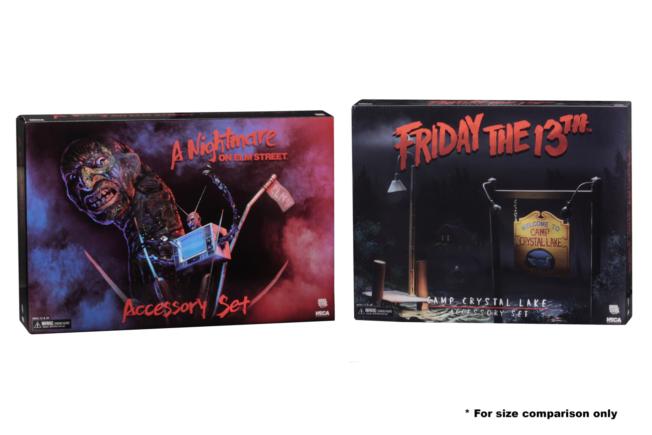 These incredible pieces are perfectly in scale with NECA’s line of 7″ figures and include some truly iconic pieces from the cult classic horror movies. The set comes in closed box packaging featuring artwork created just for this release.