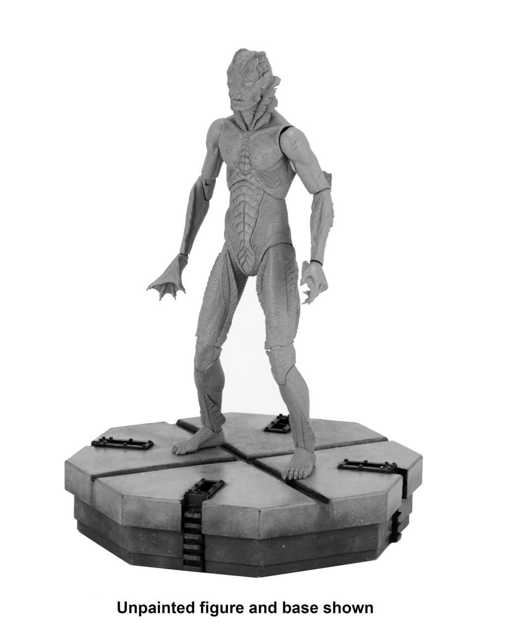 From the acclaimed film The Shape of Water, the Amphibian Man stands approximately 8” tall, is super-poseable and comes with removable shackles, interchangeable head and display base.