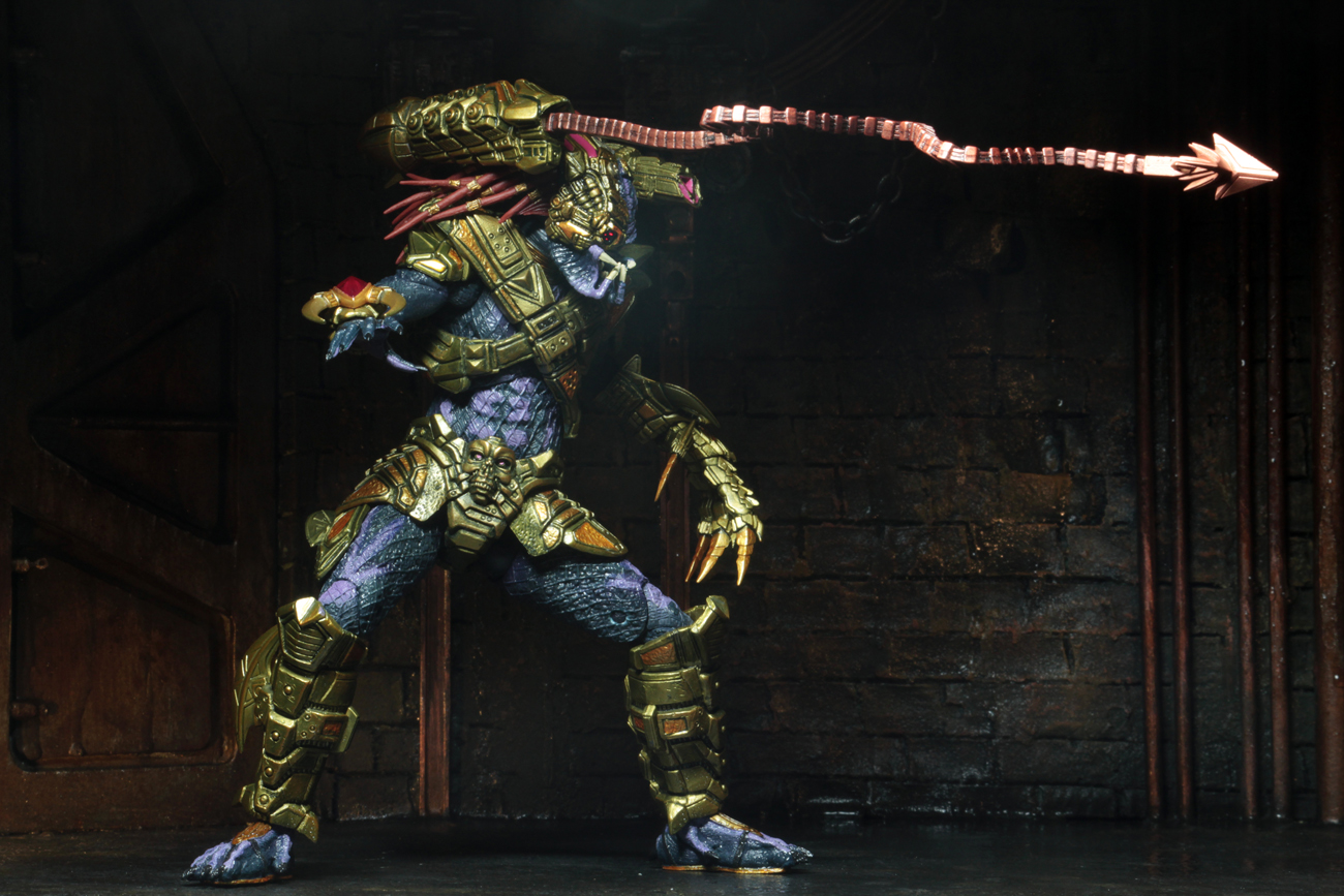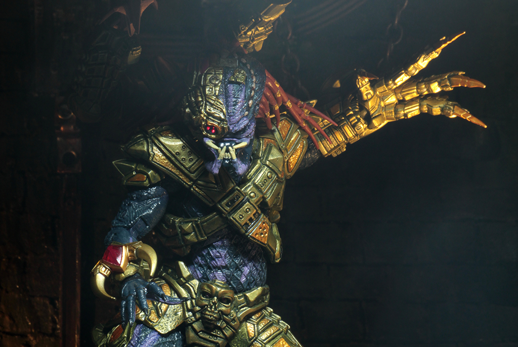Taking inspiration from the 1990s designs, our team has created a modern tribute with extra detail and articulation to bring this Predator into the new millennium. The original figure has electronic elements and this one does too—a LED targeting eye to home in on his prey. Lasershot Clan Leader stands 8.5″ tall, has over 30 points of articulation and comes with removable mask, detachable wrist shield, flexible grappling hook that attaches to his assault cannon, and a swappable clawed left hand with articulation.