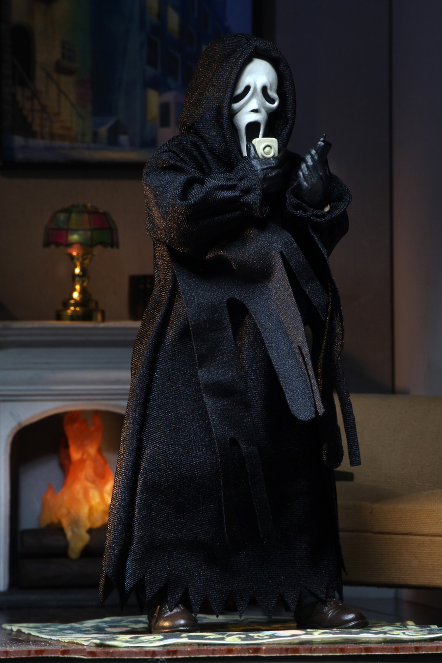 Ghost Face stands 8″ tall and is fully poseable, with a tailored robe, hood and sleeves modeled after the real-life Ghost Face costume. He features a sculpted mask, interchangeable hands, and comes complete with his signature knife.