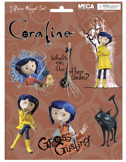 Whether you’re attaching a shopping list to the fridge or decorating your locker, these magnets from the fun and spooky world of Coraline will send a message on any metal surface. The set of 7 magnets features Coraline, The Cat, quotes and more.