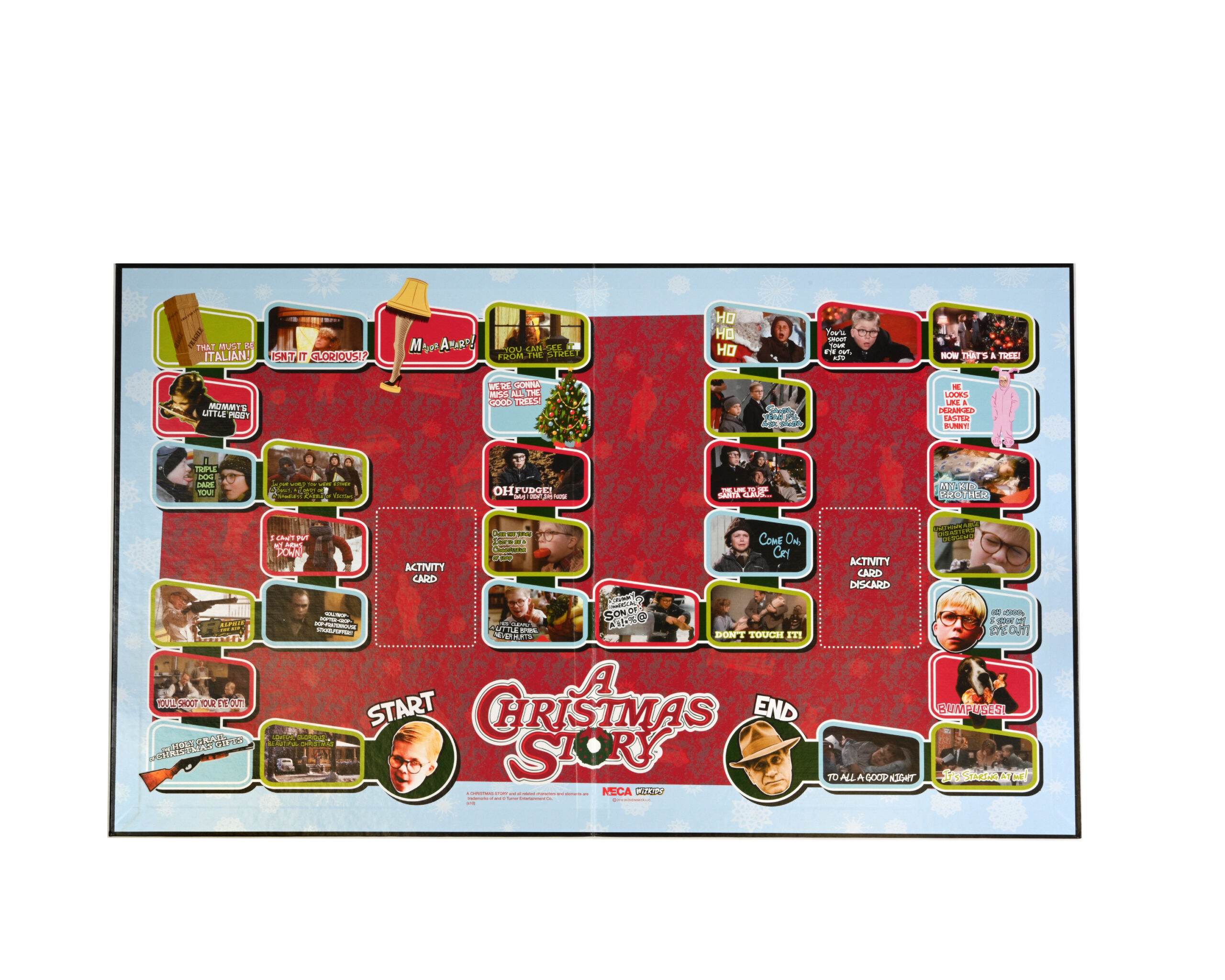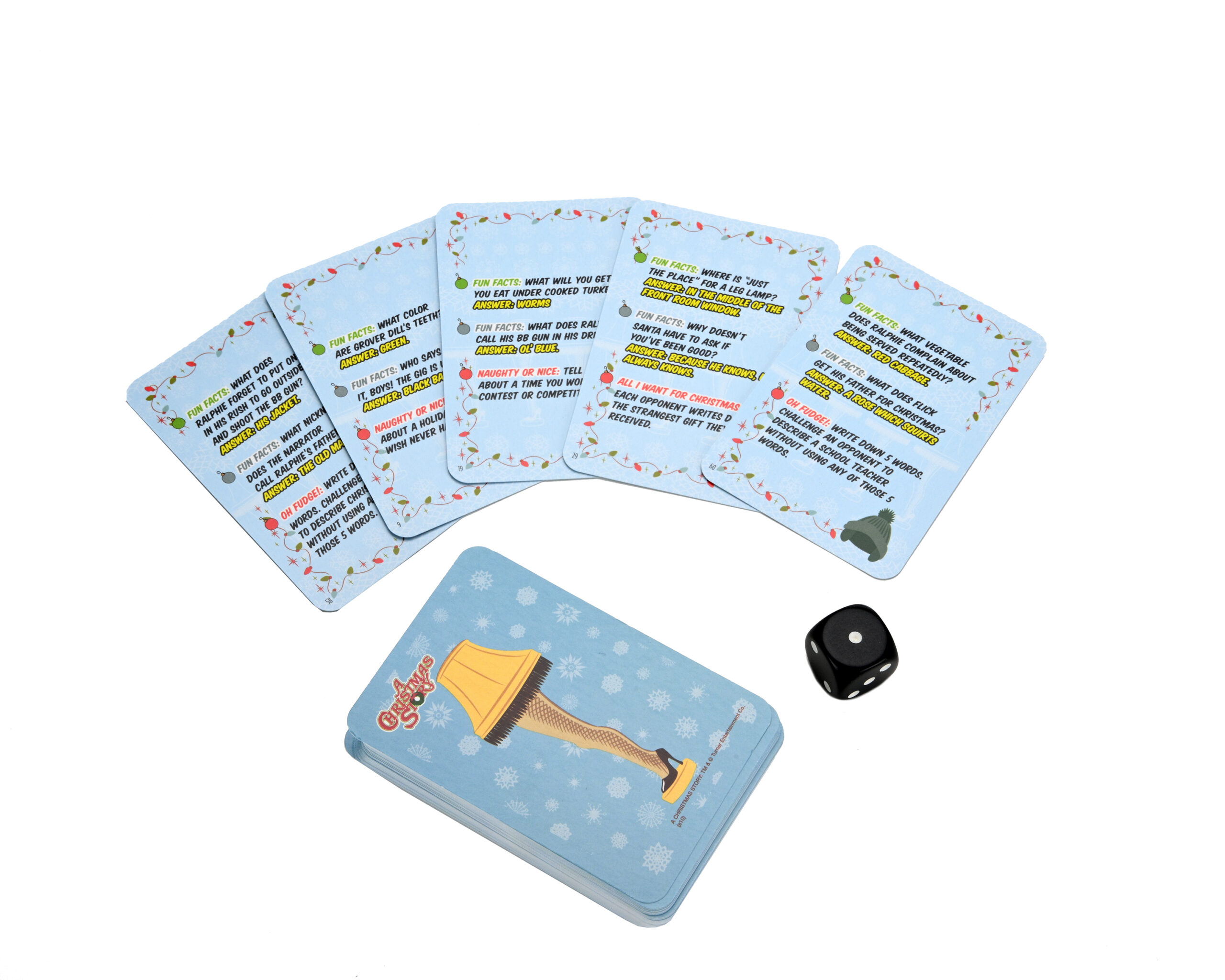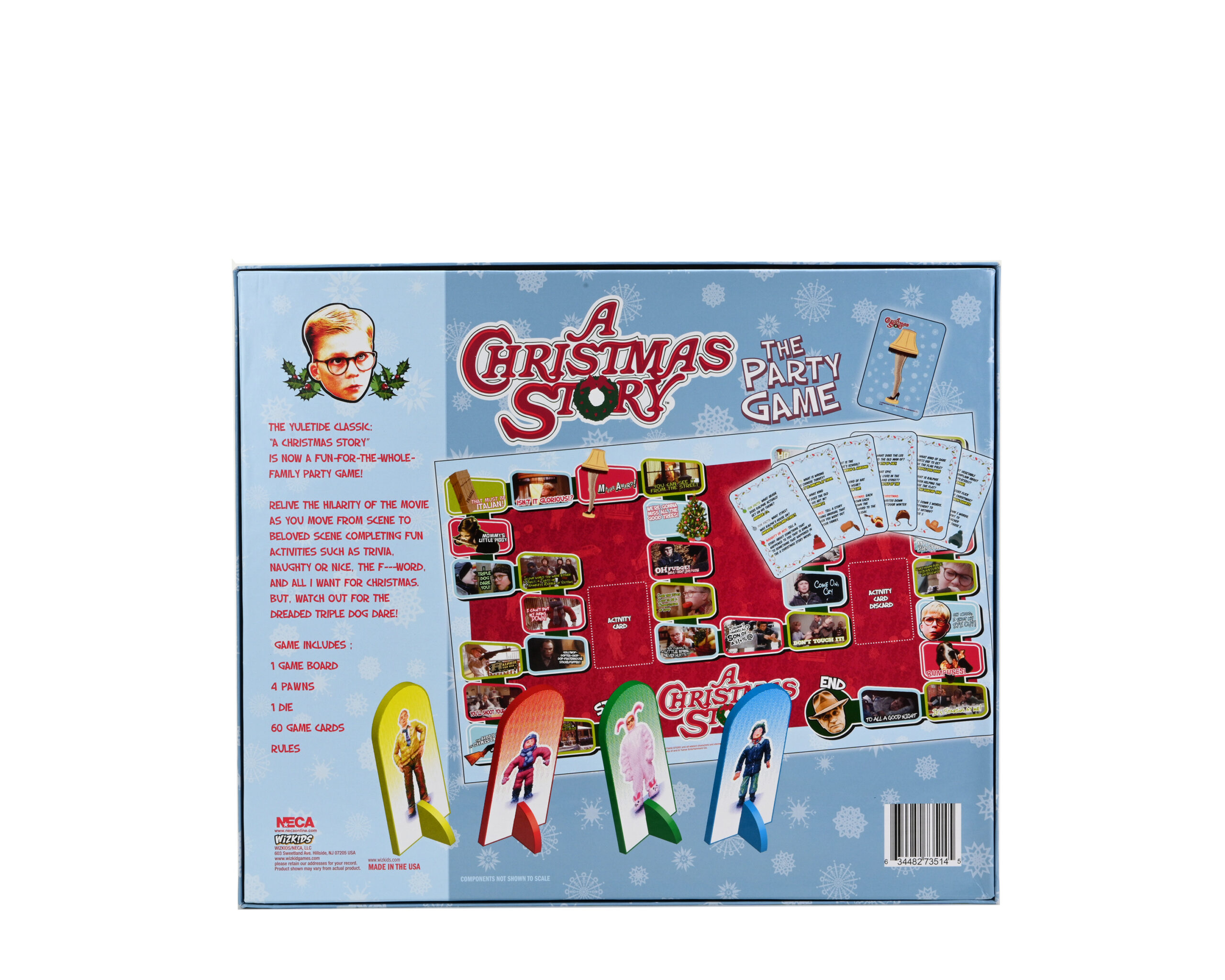 The Yuletide classic movie A Christmas Story is now a fun-for-the-whole-family party game! Relive the hilarity of the movie as you move from scene to beloved scene completing fun activities such as Trivia, Naughty or Nice, the F— Word, and All I Want for Christmas. But watch out for the dreaded triple-dog-dare! Game includes: 1 game board, 4 game pieces, 1 die, and 60 cards.