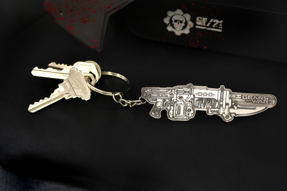 This metal keychain shows the Retro Lancer seen in Gears of War 3 in 3D relief! It’s a relic of the Pendulum Wars, but still effective in a skirmish with Locusts. The reverse shows the logo of the best-selling video game. Ready to attach to car or house keys.