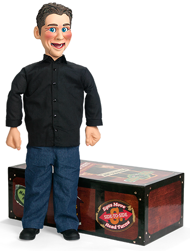 The puppet operates using a trigger control stick inside the body, comes with a custom storage case, and includes an instructional DVD with tips from Jeff on how to perfect your own ventriloquism act and a 28-page booklet with sample routines and even more to help you get started!