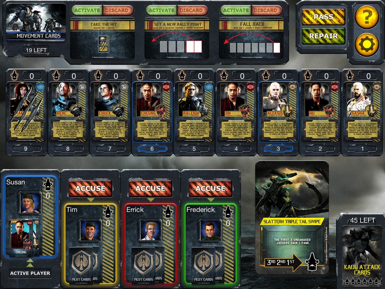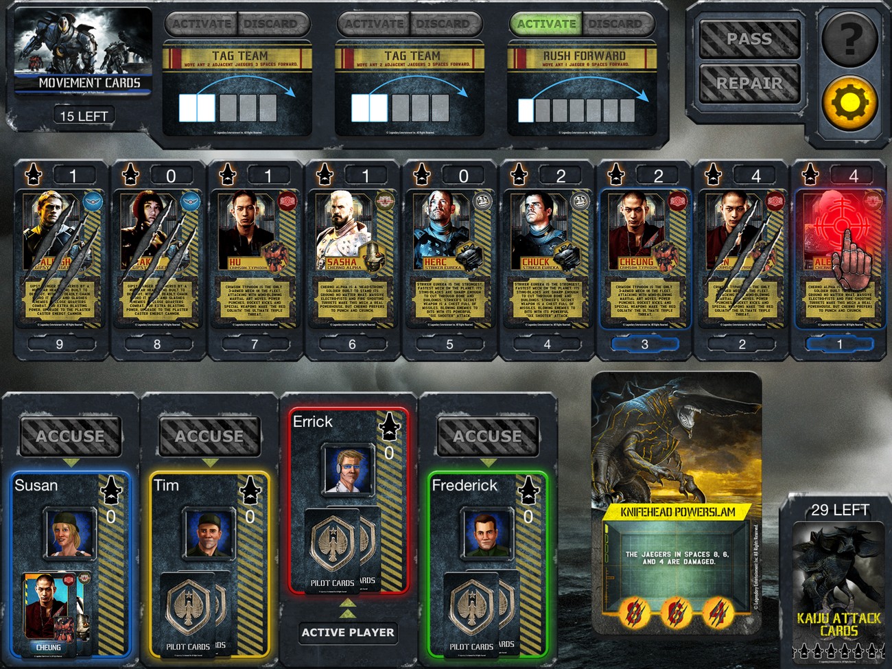 In the Pacific Rim Shuffling the Deck™ card game, each player secretly controls characters from the movie that are piloting Jaegers. Each turn, a Kaiju attack card will be executed — awarding fame as the Jaegers repel the attack, causing the Jaegers to take damage or causing the Jaegers to lose fame if the Kaiju manage to beat them back. The players use movement cards to get their pilots into the best position for the current Kaiju attack. The players who gain the most fame will win the game when all of the Kaiju attack cards run out.