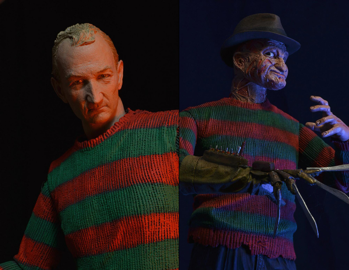 Also from Freddy’s Dead, we have “Fred Krueger: The Springwood Slasher” featuring the likeness of actor Robert Englund as Freddy before the burns, in his human form with photo-realistic portrait, gloved right hand, unburned left hand, and removable hat. This is how Freddy looked before he became the monster that haunts your dreams.