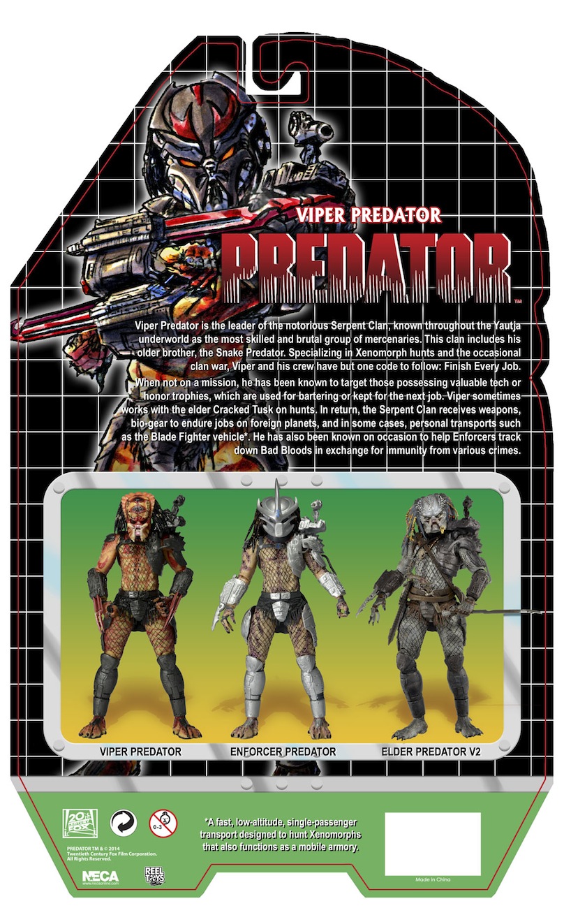 For our next in-depth look at Series 12, we’re proud to present a very special Predator, created by NECA with all official blessings. Viper Predator is the leader of the mercenary Serpent Clan and specializes in hunting Xenomorphs (and the occasional Bad Blood), often using the Blade Fighter vehicle.