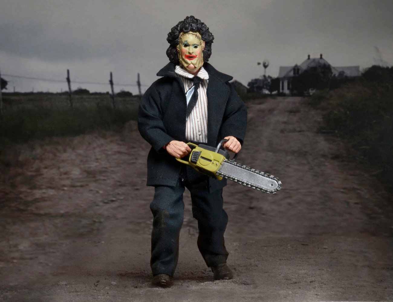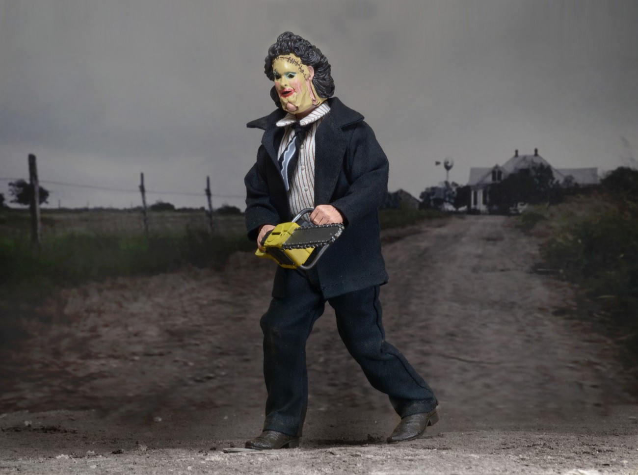 The poseable 8” figure is dressed in tailored fabric clothing similar to the toy lines that helped define the licensed action figure market in the 1970s. For the special occasion, Leatherface wears a dinner jacket, shirt and pants, and a newly sculpted, “Pretty Woman” version of his mask. He comes complete with chainsaw accessory.