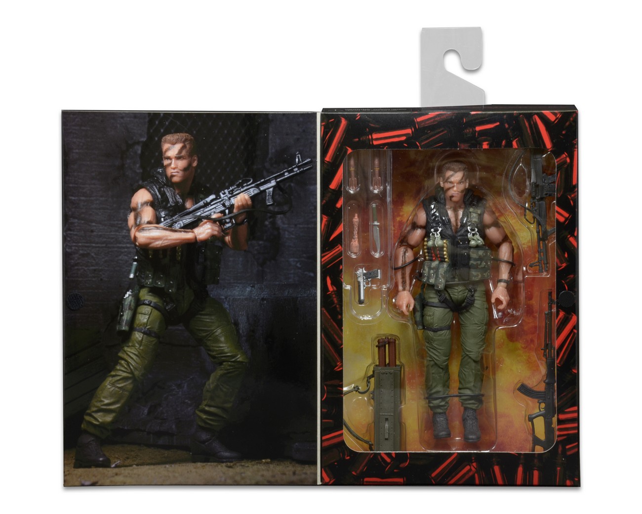 This deluxe 7” scale action figure features the authorized likeness of Arnold Schwarzenegger and over 25 points of articulation. As befits a former special operative, it’s loaded with deadly accessories: knife that fits into a sheath, Desert Eagle pistol that fits into a side holster, M60E3 machine gun, Valmet M78/83 machine gun, and a massive M202A1 FLASH rocket launcher with removable launching rocket attachment.