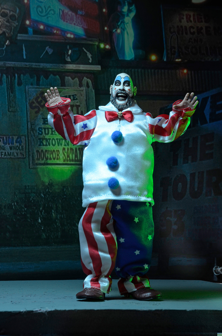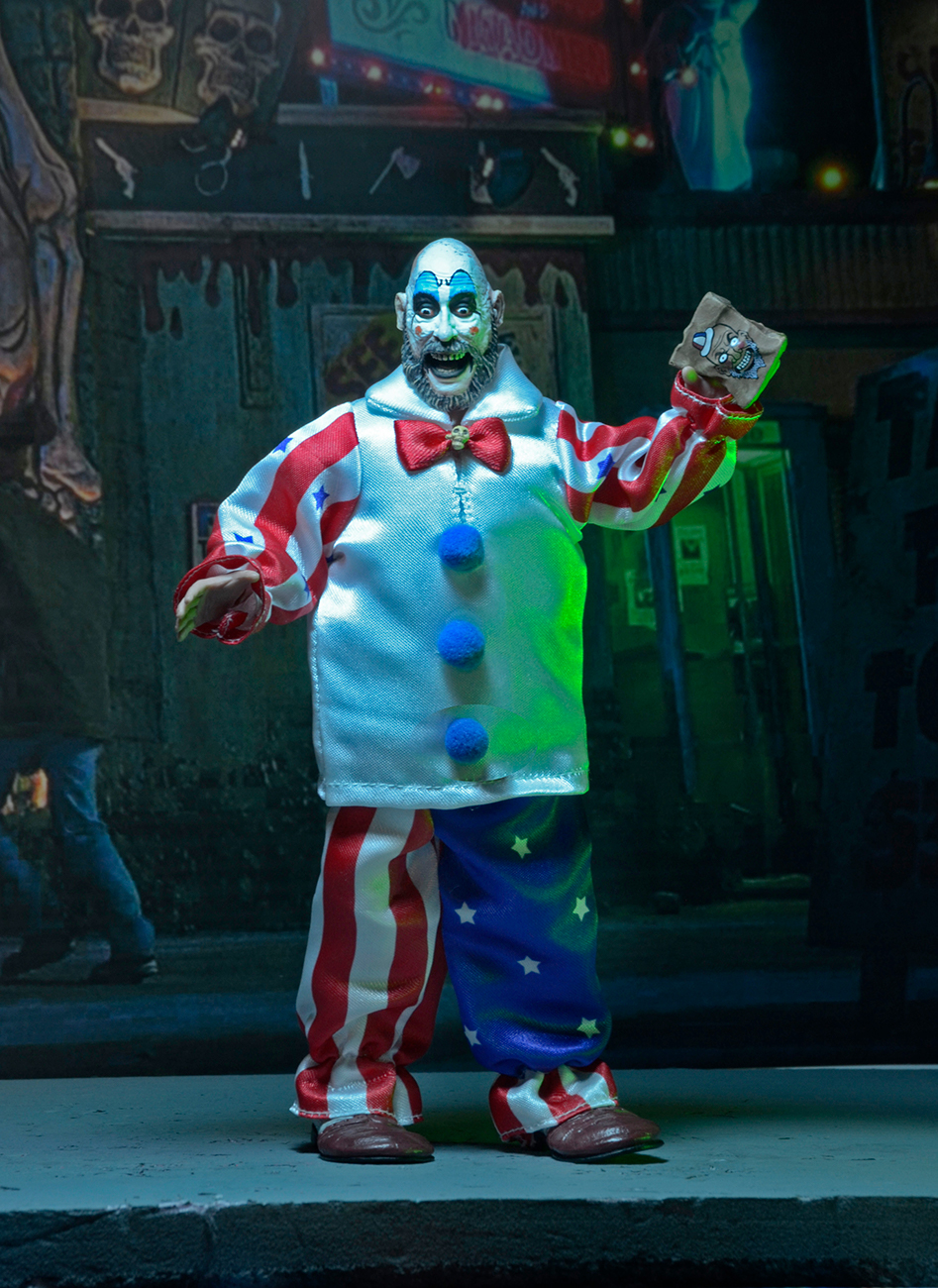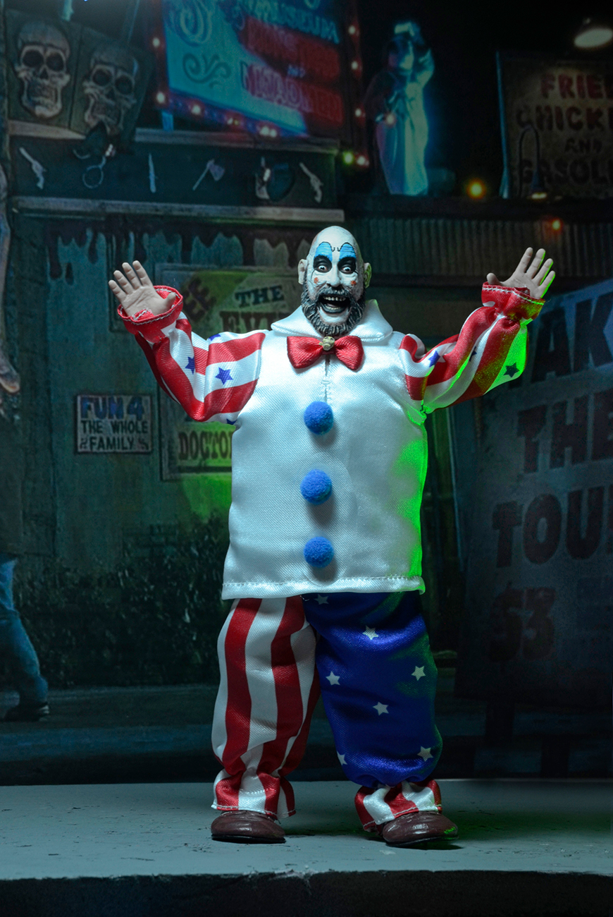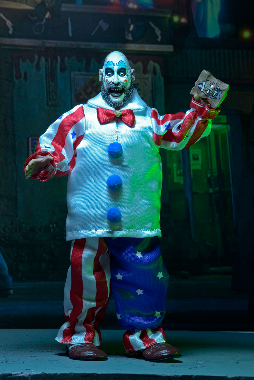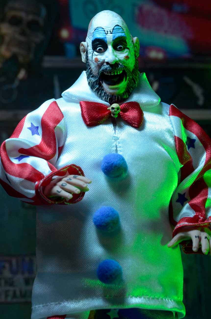 From the cult Rob Zombie film House of 1000 Corpses, Captain Spaulding stands 8” tall and is dressed in fabric clown attire. He’s fully poseable and truly terrifying! Comes in resealable protective clamshell packaging featuring custom artwork created just for this release.