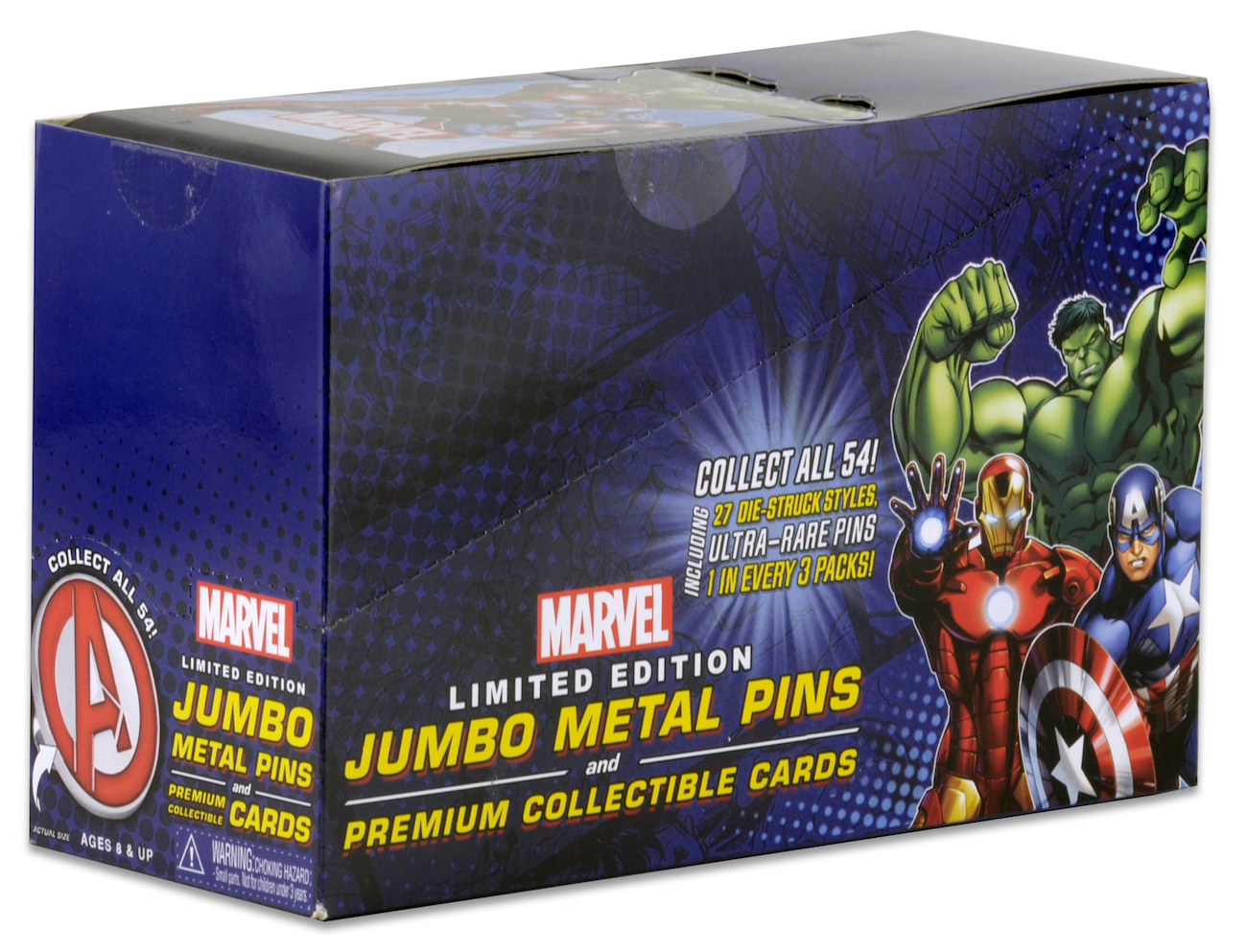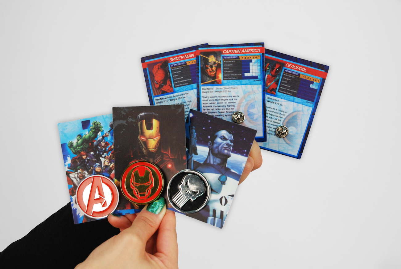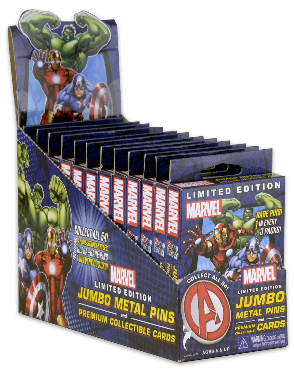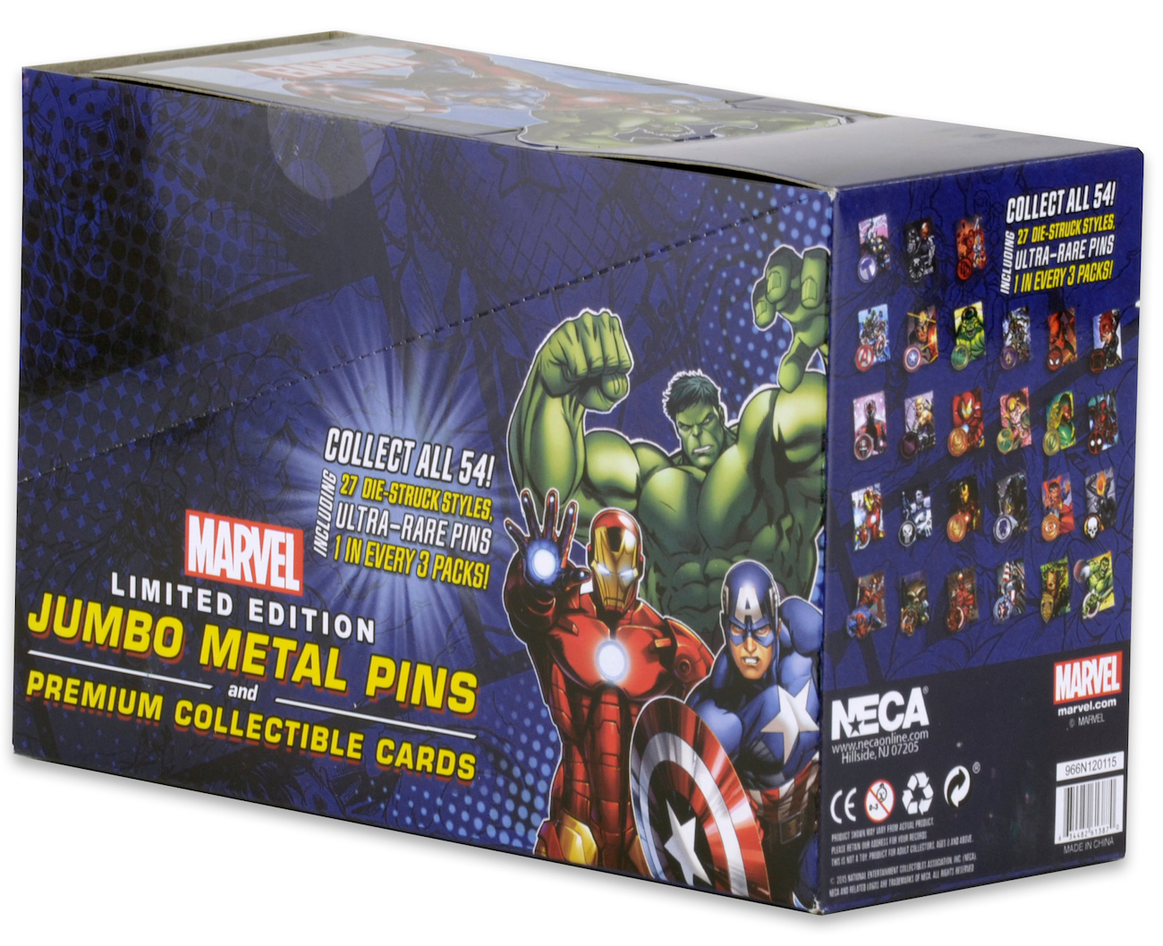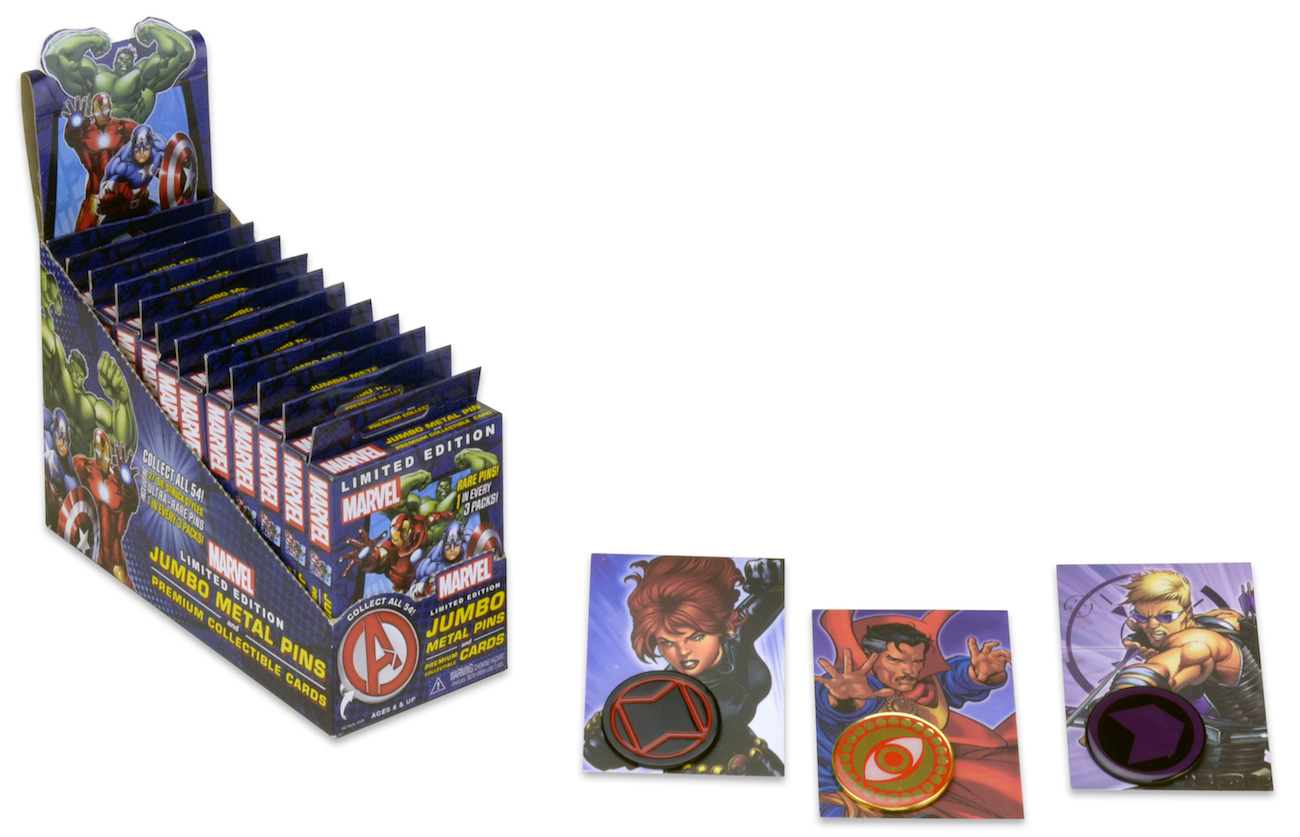 Each blind box includes one jumbo metal pin and one full-color, double-sided, premium collectible card for a character (or team) from the Marvel comic book universe. There are 27 fan-favorite characters in all, like Spider-Man, Captain America, Hulk, Doctor Strange, Iron Fist and many more.