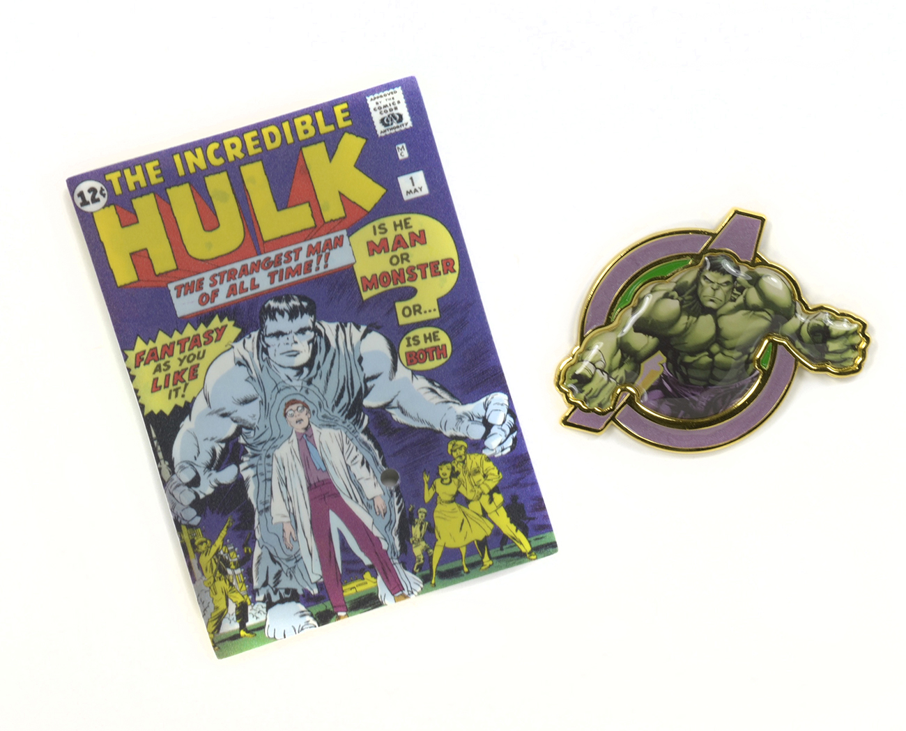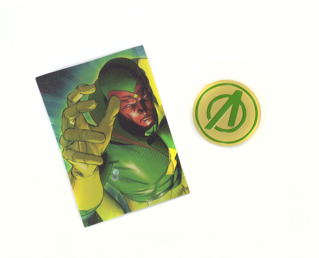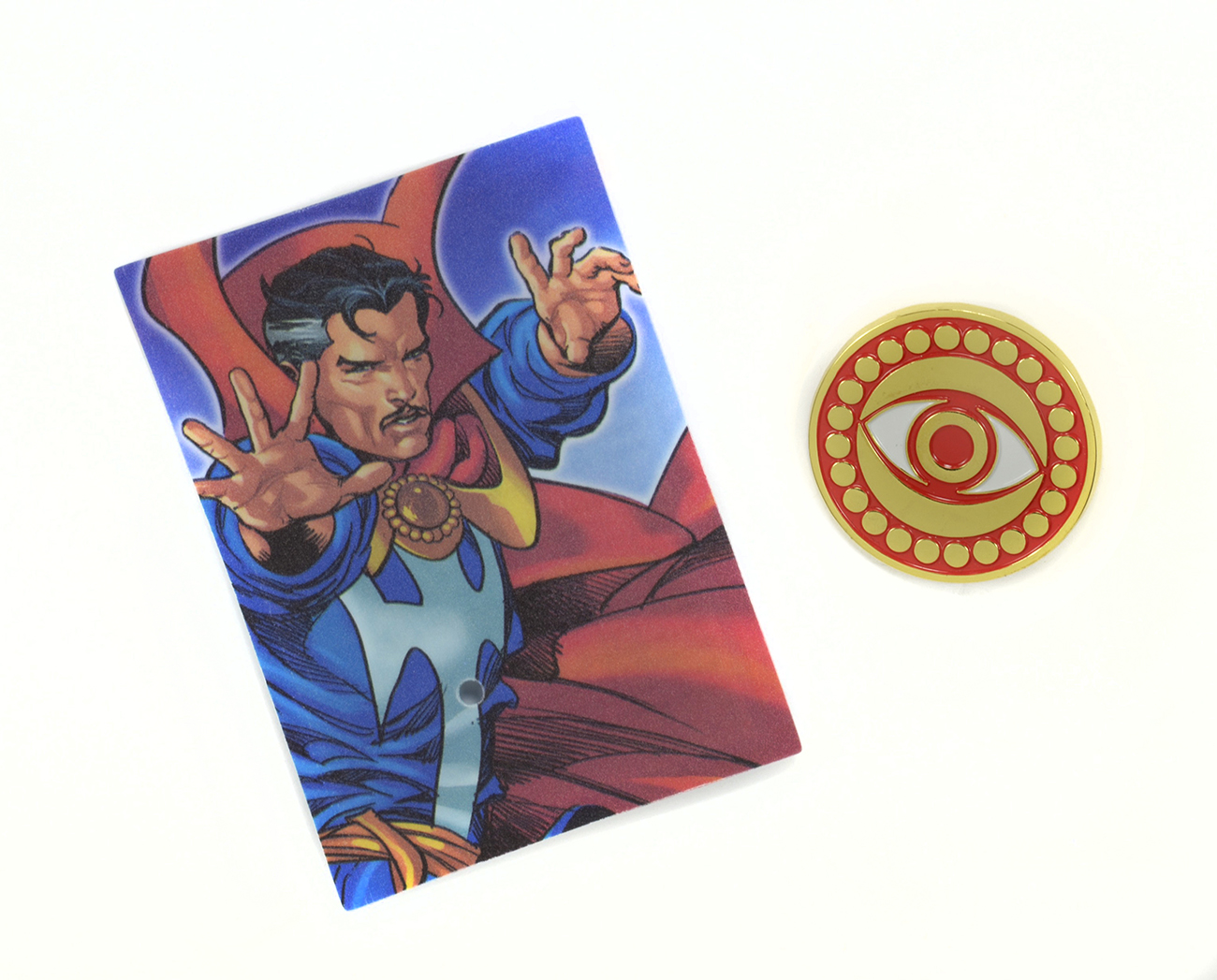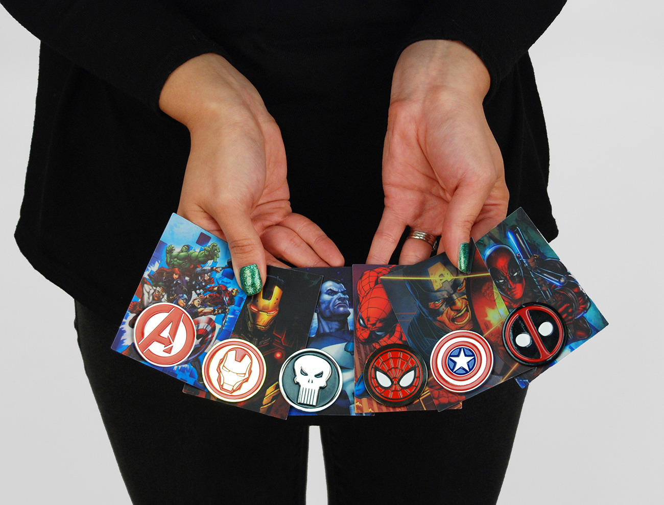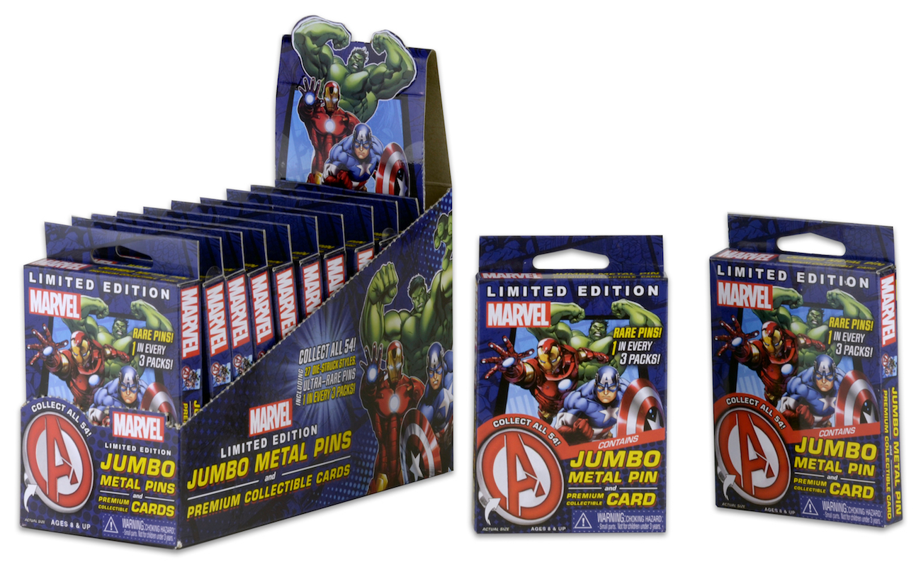 Each blind box includes one jumbo metal pin and one full-color, double-sided, premium collectible card for a character (or team) from the Marvel comic book universe. There are 27 fan-favorite characters in all, like Spider-Man, Captain America, Hulk, Doctor Strange, Iron Fist and many more.