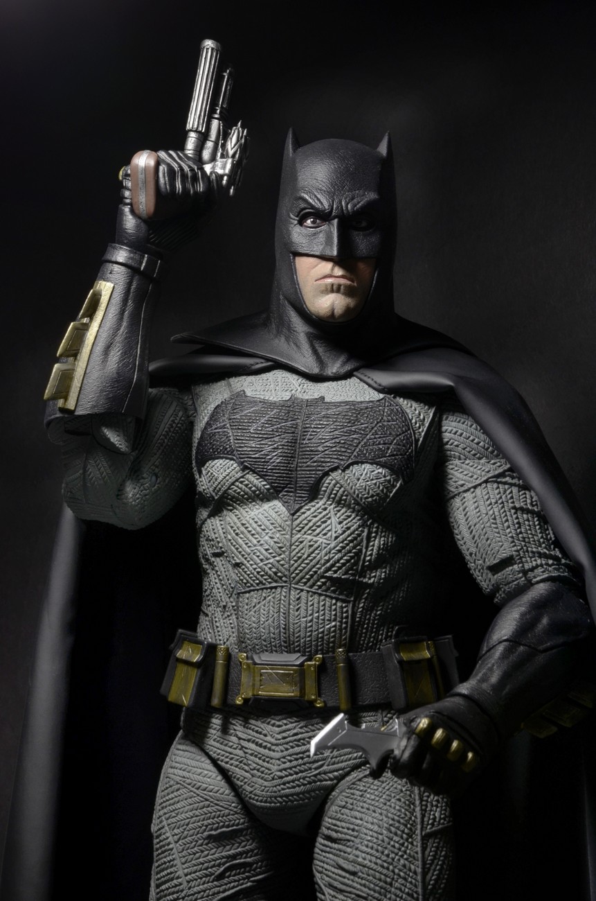 The figure stands just under 19” tall and has nearly 30 points of articulation for dynamic poses. Batman features plenty of movie-accurate detail and is sculpted with the likeness of actor Ben Affleck. Comes with two sets of hands, two different Batarangs, and Grapnel accessory with a clip that allows it to be attached to Batman’s belt. Window box packaging.