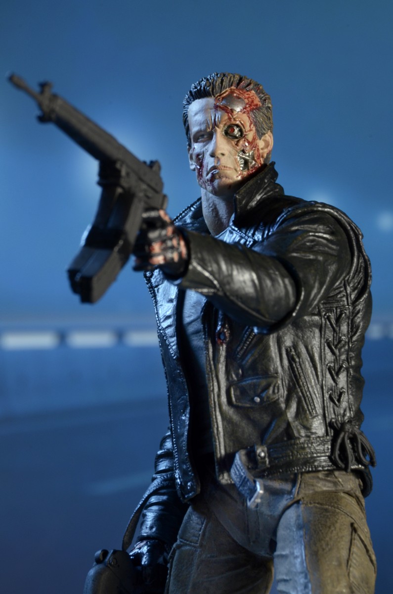 The Ultimate Police Station Assault T-800 features a detailed, bullet-riddled motorcycle jacket and bears the likeness of Arnold Schwarzenegger. The deluxe 7” scale figure has over 25 points of articulation, 3 interchangeable heads, 2 pairs of hands, and SPAS-12 shotgun, AR-18 assault rifle, and Smith & Wesson Model 15 handgun accessories.