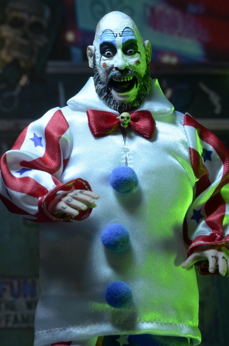 Stop by Captain Spaulding’s Museum of Monsters and Madmen — it’s fun for the whole family! (If you’re the Manson family!) From the cult Rob Zombie film, our newest retro clothed action figure is Captain Spaulding from House of 1000 Corpses in classic clown attire.