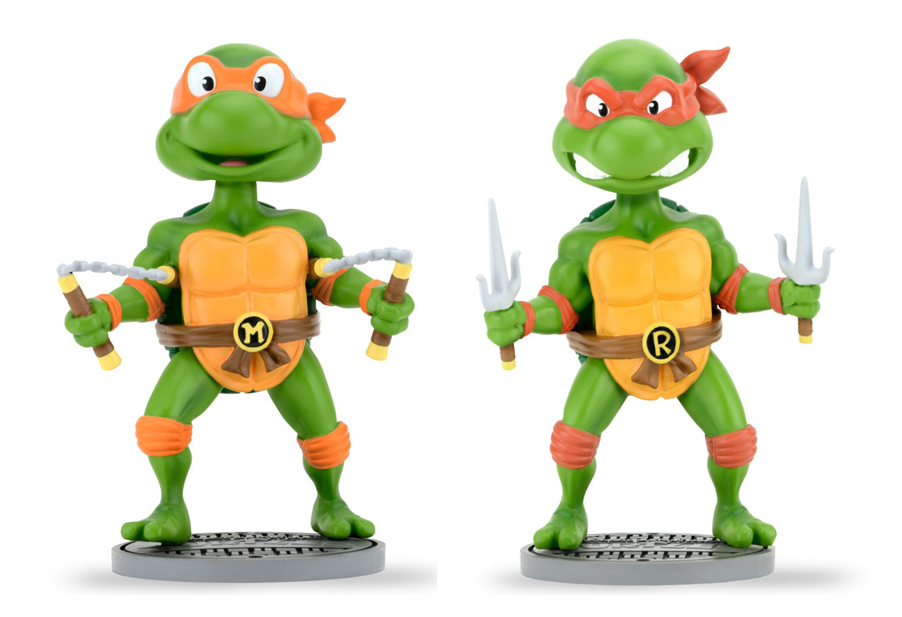 Cowabunga, dude! Bring home some radical head-bobblin’ action from the classic Teenage Mutant Ninja Turtles cartoon. This assortment includes Michelangelo and Raphael Head Knockers. You’d normally find them deep in the sewers, almost singlehandedly keeping the local pizza parlors in business between rounds of putting the damage to the nefarious Foot Clan, but now they can adorn your shelf.
