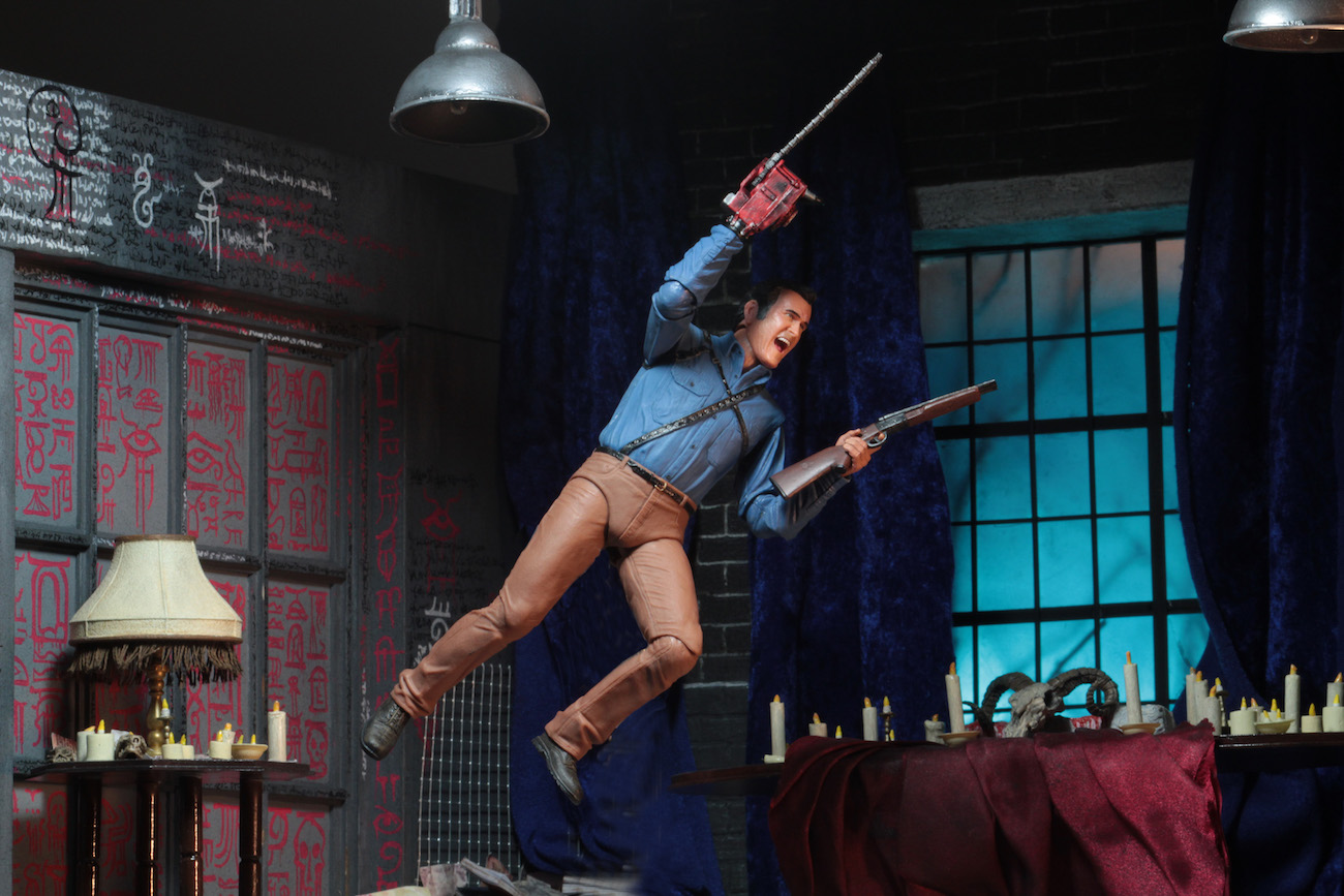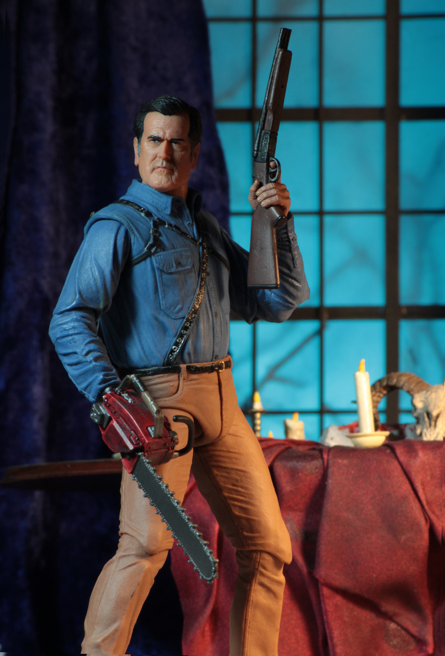 NECA has given Ash the Ultimate action figure treatment—he comes with four interchangeable head sculpts, chainsaw, mechanical hand, wood hand, hand stump, photo of his car, and shotgun that fits in a back holster… Everything he needs to fight a plague of Deadites.