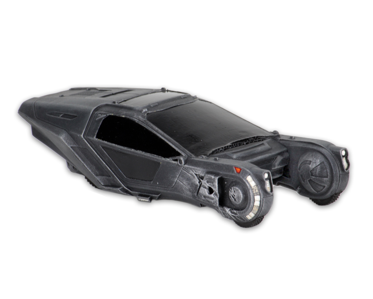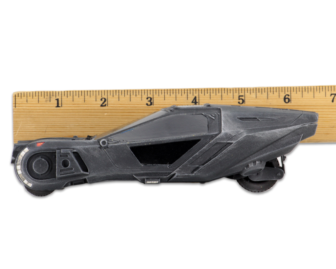 From Blade Runner 2049, the Spinner measures approximately 6” long and features rolling wheels.