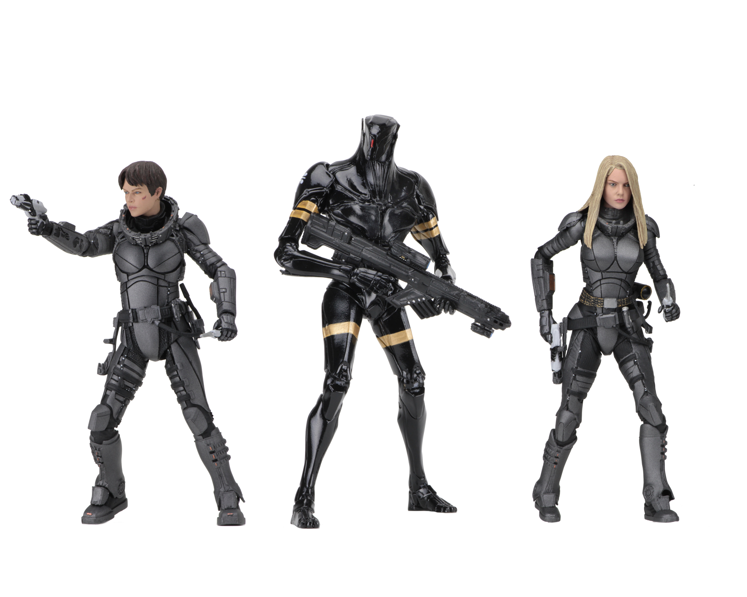The assortment includes Valerian (with likeness of Dane DeHaan), Laureline (with likeness of Cara Delevigne), and police robot K-Tron. Each fully articulated, highly detailed figure stands approximately 7” tall and comes with character-specific accessories. Window box packaging.