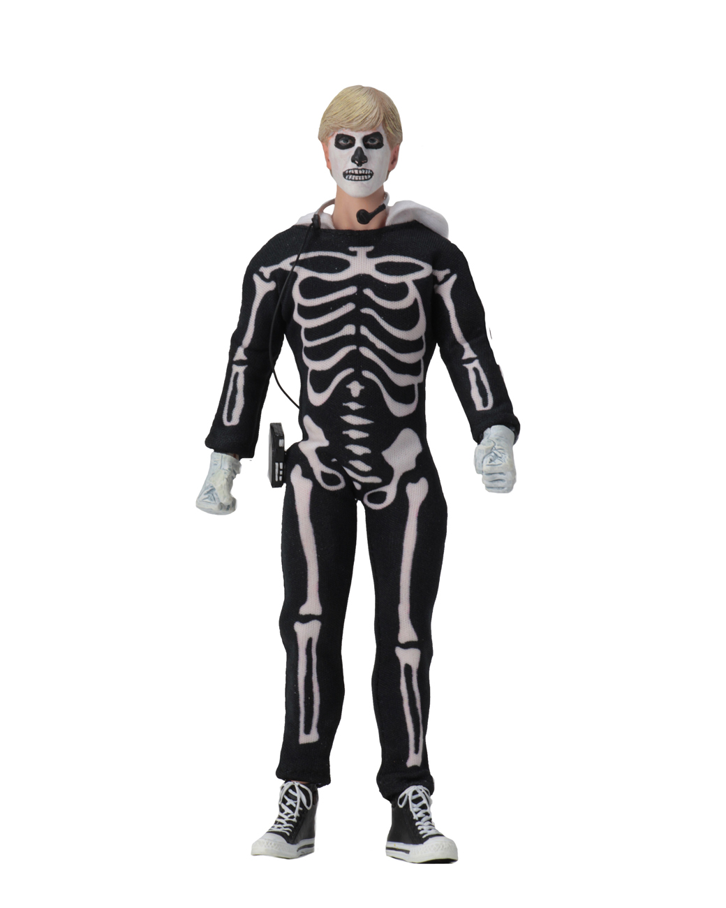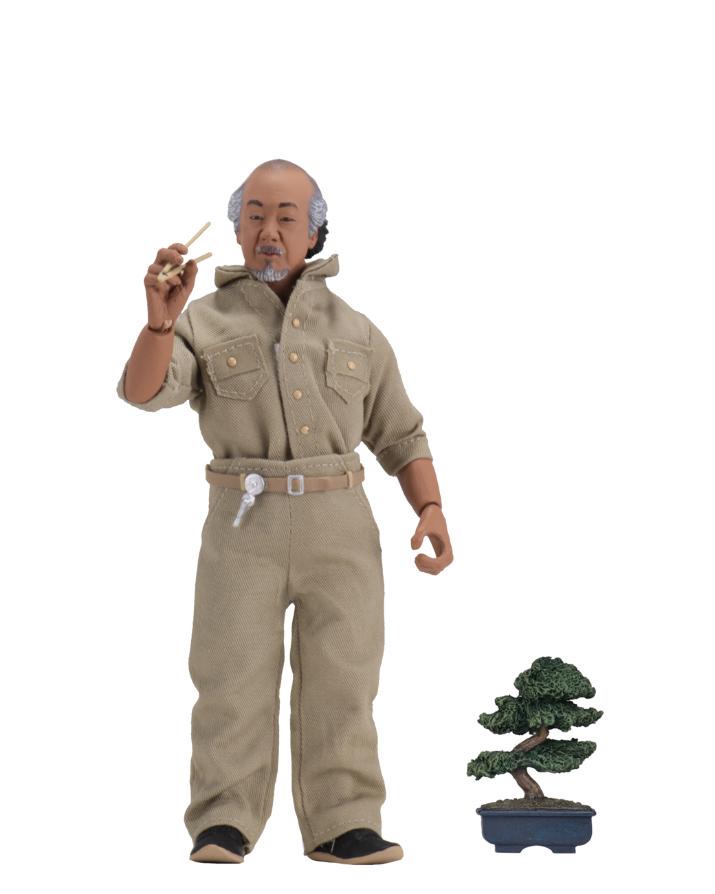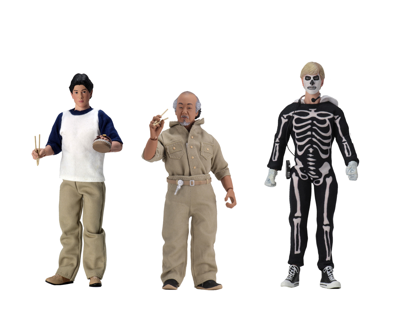 These clothed action figures include Daniel, Mr. Miyagi, and Johnny in his skeleton costume. Daniel comes with bonsai tree, Japanese sanders, alternate hand holding chopsticks, bottle of car wax and buffer accessories. Mr. Miyagi comes with bonsai tree and alternate hand holding chopsticks. Skeleton Johnny comes with a Walkman accessory. Each fully articulated figure stands approximately 8” tall and features an authorized likeness.