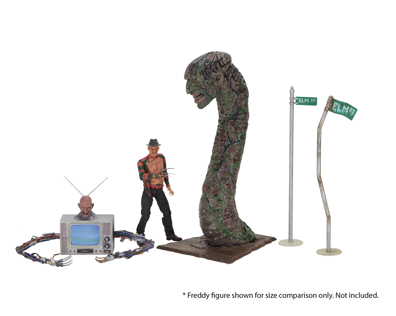 – Freddy Worm (as seen in Dream Warriors) – Stands over 12” tall! Features an articulated head and a display base styled as broken floor boards.