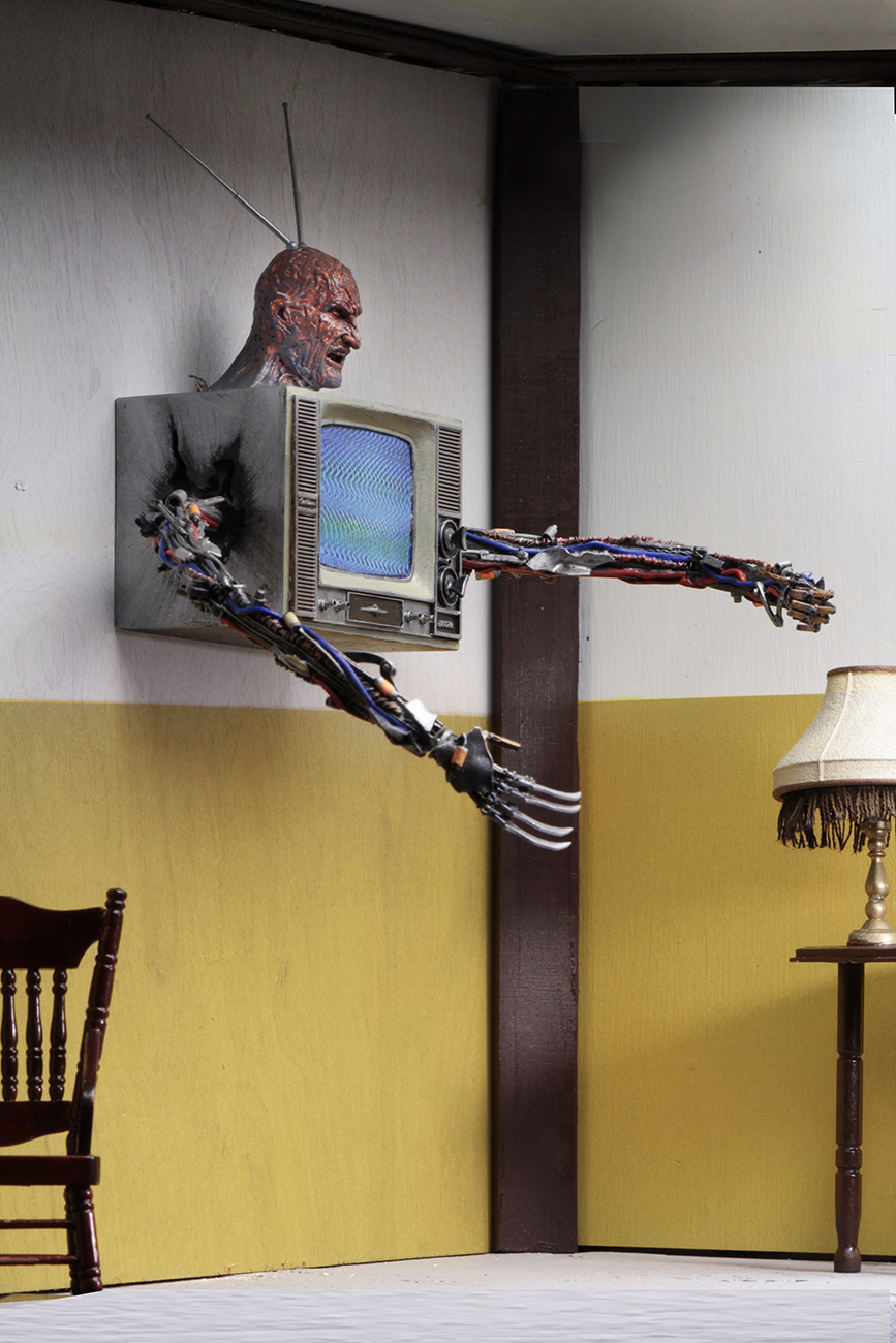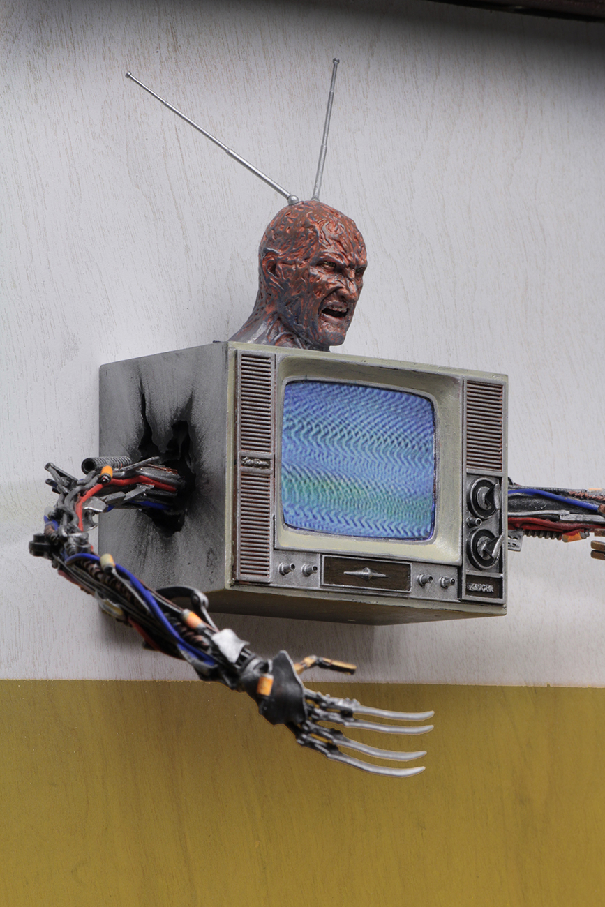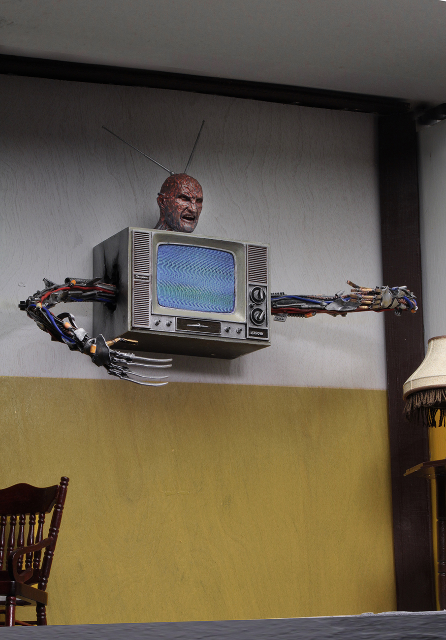 – Freddy TV (as seen in Dream Warriors) – Can be mounted on a diorama wall or displayed on desk or shelf. The arms are articulated and the antenna on Freddy’s head can be positioned.