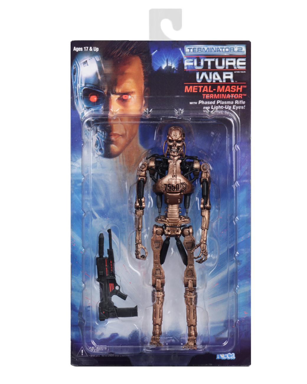 Power Arm T-800 features a detailed weapons arm with interchangeable missile launcher and grabbing claw attachments. White Hot T-1000 changes color when dunked in water, just like the original version. Metal Mash Endoskeleton features working pistons and comes with a plasma rifle accessory. Each figure stands approximately 7” tall and is fully articulated.