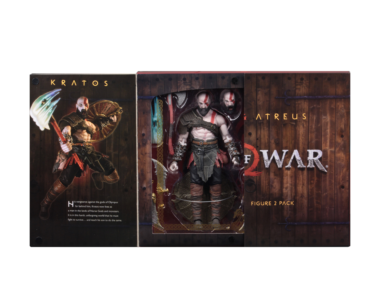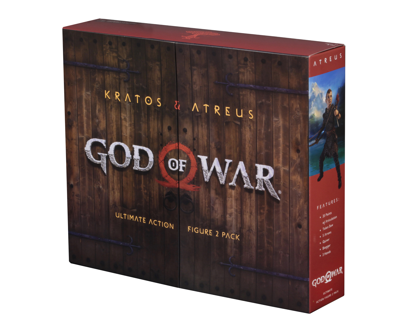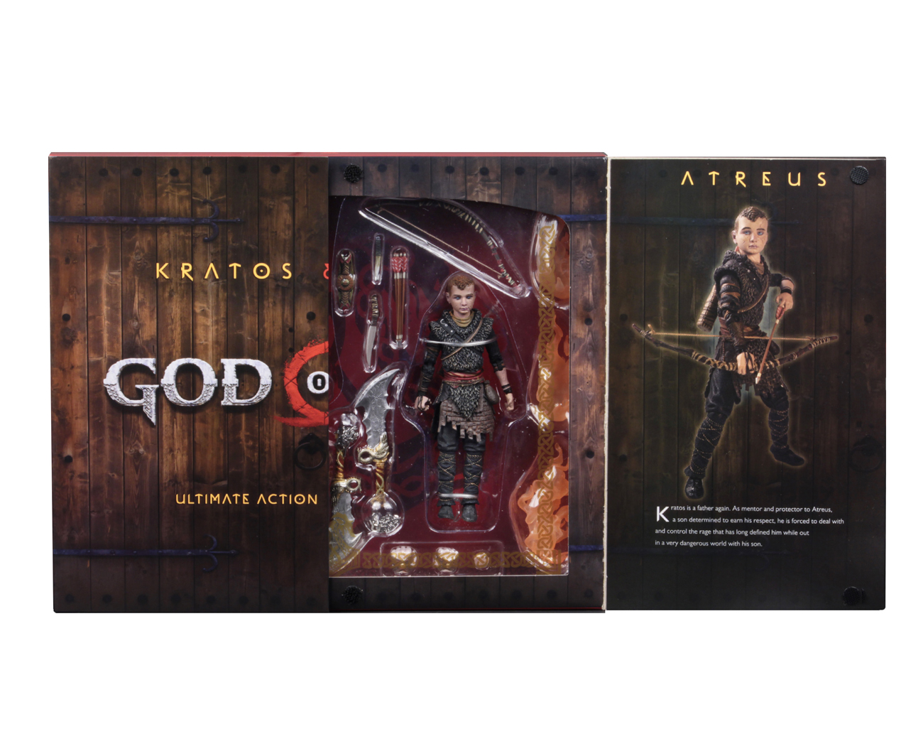 This Ultimate 7” scale action figure 2-pack includes Kratos and his son Atreus. Kratos features a new aggressive head sculpt, new Mimir head on right hip, new gauntlets, new hands, new collapsed shield, new blades, and new fire and frost effects for weapons and hands, as well as 36 points of articulation. The all-new Atreus has over 25 points of articulation and comes with bow and arrows.