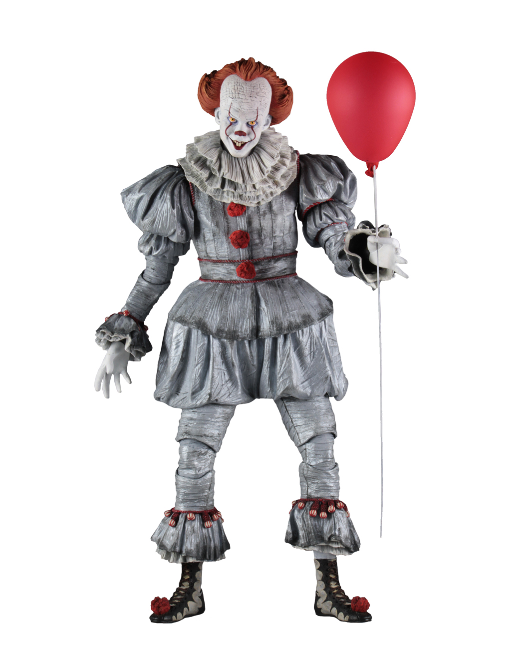 Based on Bill Skarsgård’s portrayal of the nightmare-inducing clown, this menacing 18” figure has been painstakingly detailed to be as accurate to Pennywise’s elaborate costume as possible. To recreate the most terrifying scenes from the movie, the fully articulated figure features interchangeable hands and signature red balloon.