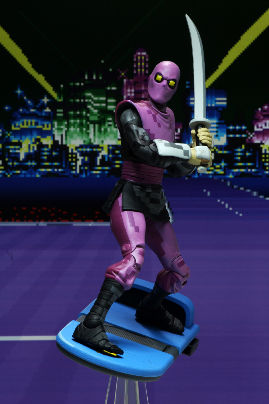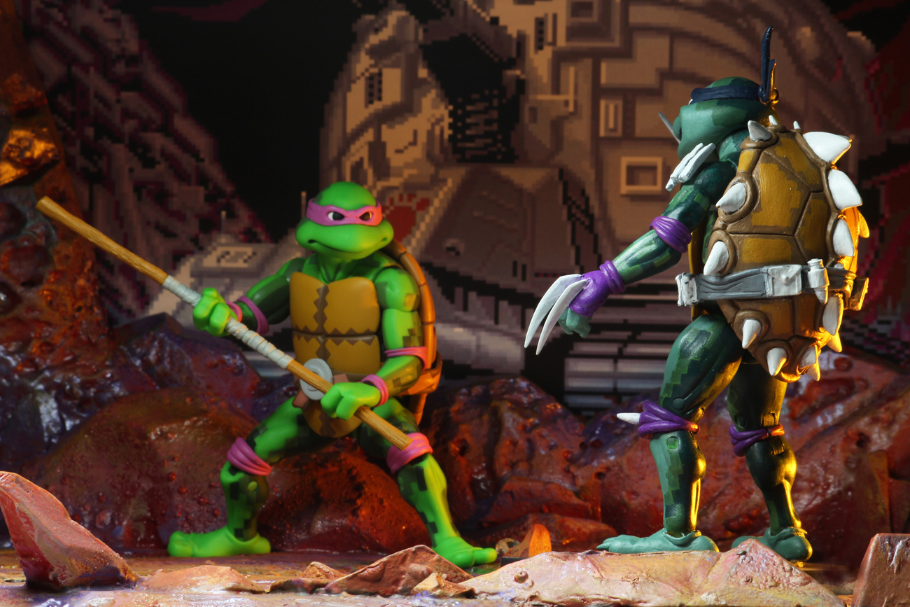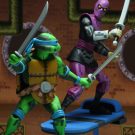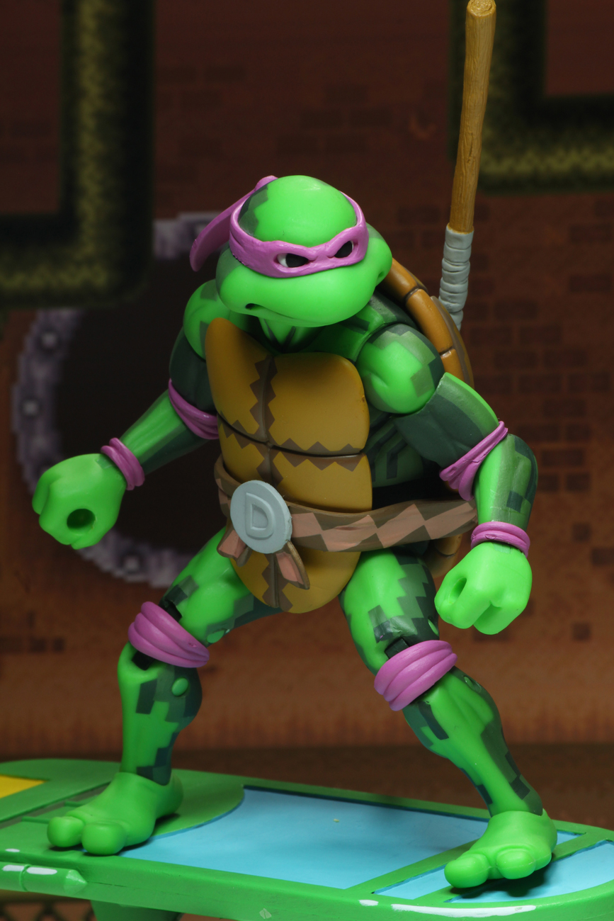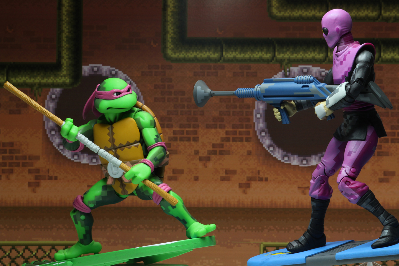 From the classic 1990s Turtles in Time video game, we’re excited to offer a new line-up of 7” scale action figures. Series 1 includes Donatello, Leonardo, Slash, and a Foot Soldier. Donatello, Leonardo and Foot Soldier come with signature weapons and a brand new hoverboard with display stand that can be used for even more poses. The evil mutant turtle Slash comes with sword accessory.