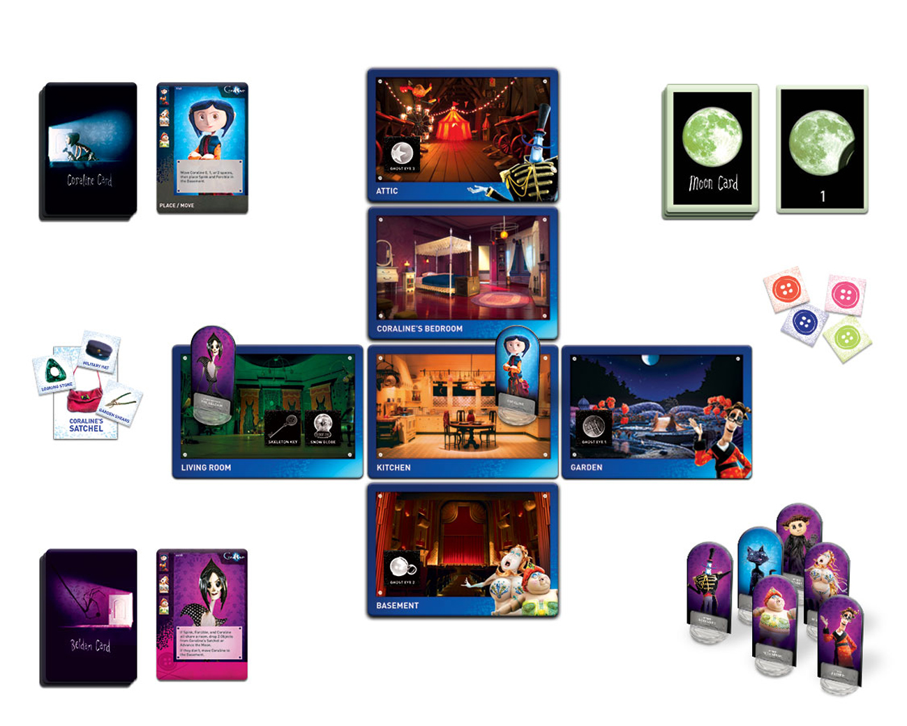 Players assume the roles of the Ghost Children who were captured by the Beldam (the Other Mother). Now they are trying to free Coraline and her parents from the Beldam’s evil clutches. They will confront Mr. Bobinsky and his jumping mouse circus, fend off the Other Father on his mantis tractor, wrestle the pearl ring from Miss Spink and Miss Forcible, and steal the Skeleton Key and Snow Globe to ultimately set Coraline free. The players all win or lose the game together as a team! But be careful! The Beldam will thwart your plans at every turn. And be quick! When the button shadow eclipses the moon, the Beldam has won the game and Coraline is trapped in the Other World forever!