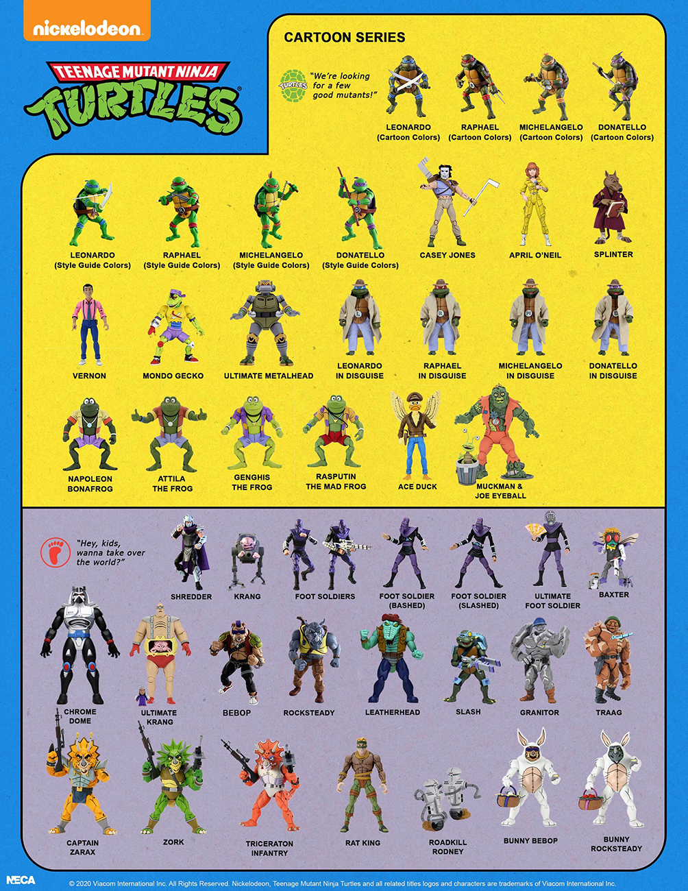 Our visual guide from yesterday was certainly missing a major part of our TMNT line. We are very excited to show off the visual guide for our TMNT Cartoon figures. Here’s some of what you can expect to see in 2021! Available as an extra-large, 300 dpi JPG. Download link appears below the image!