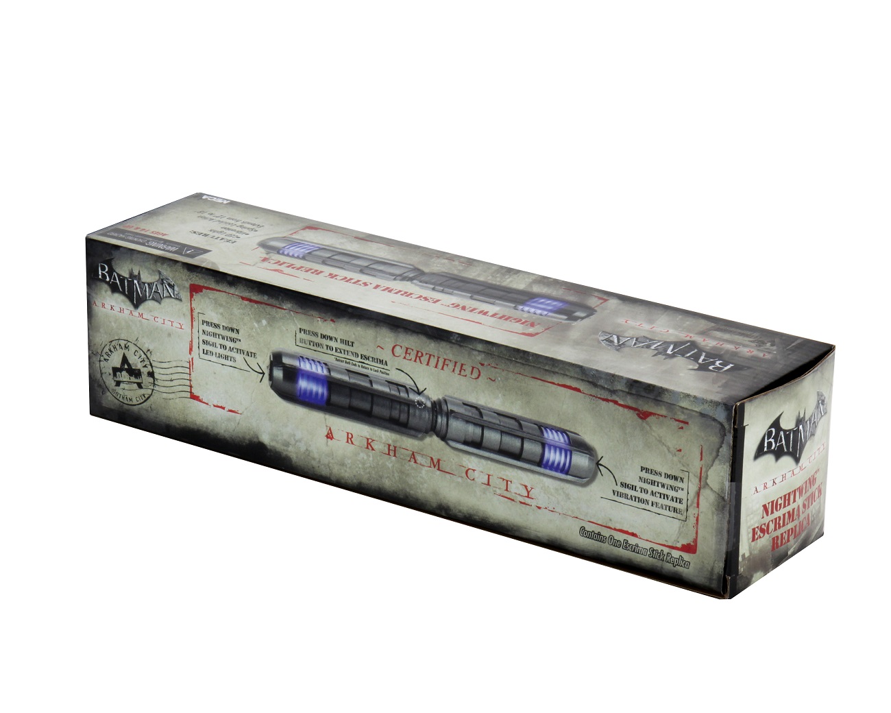 This exact replica of Nightwing’s signature Escrima Stick was created directly from the digital files used in Batman: Arkham City. It features signature LED lights and a vibration to simulate the in-game “electrical pulse” that makes it such a powerful weapon. The replica measures 12 inches retracted, and springs open to 18 inches.