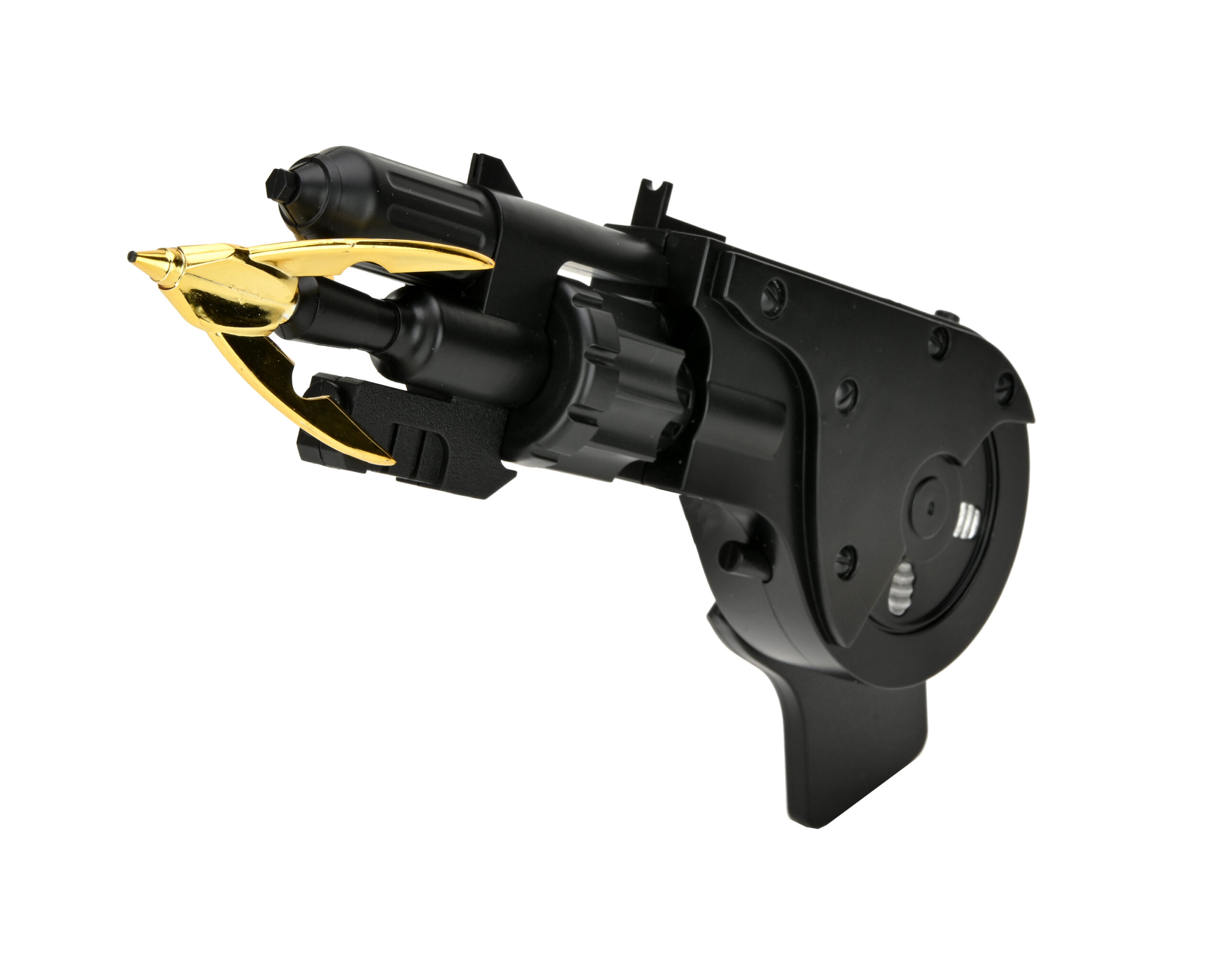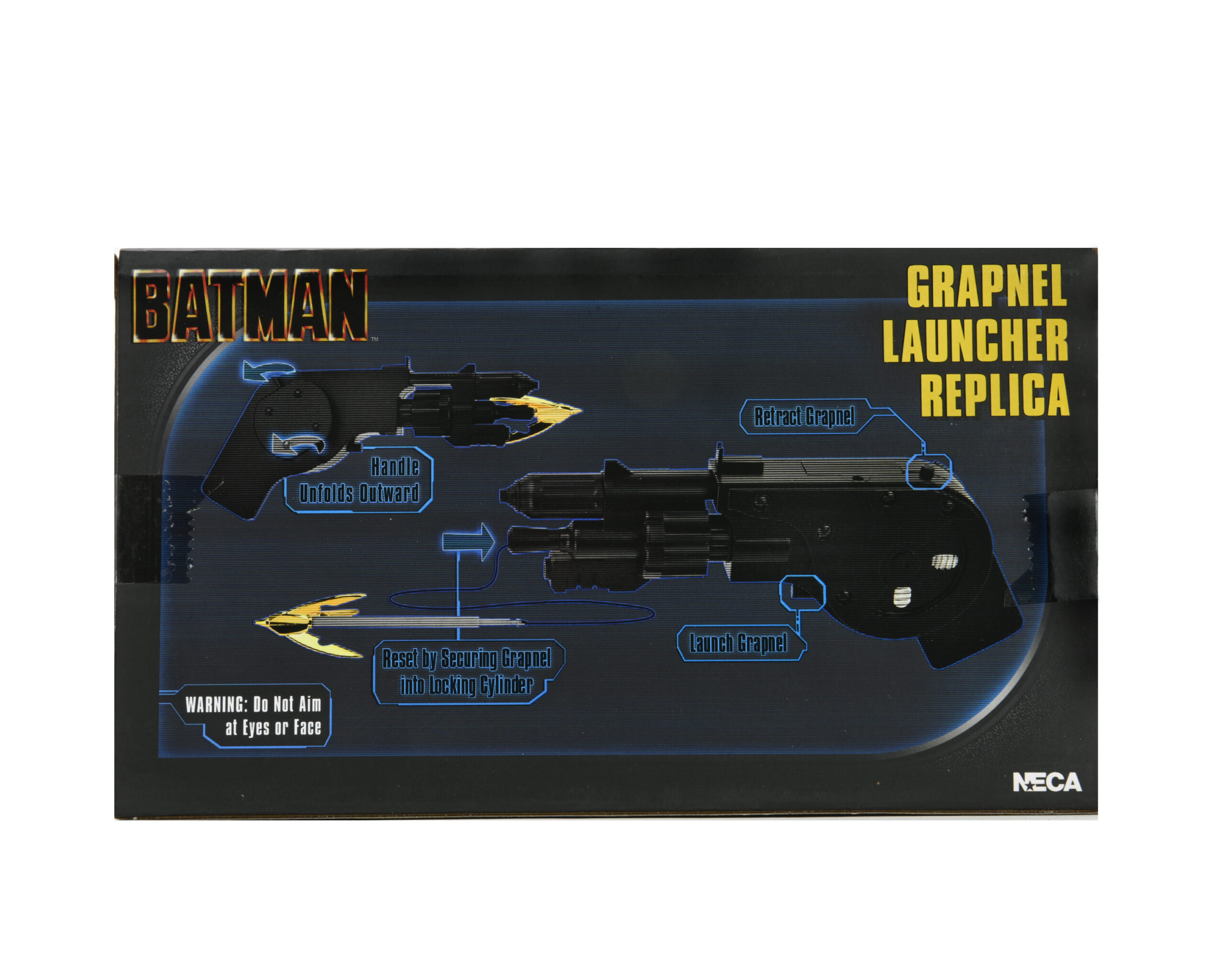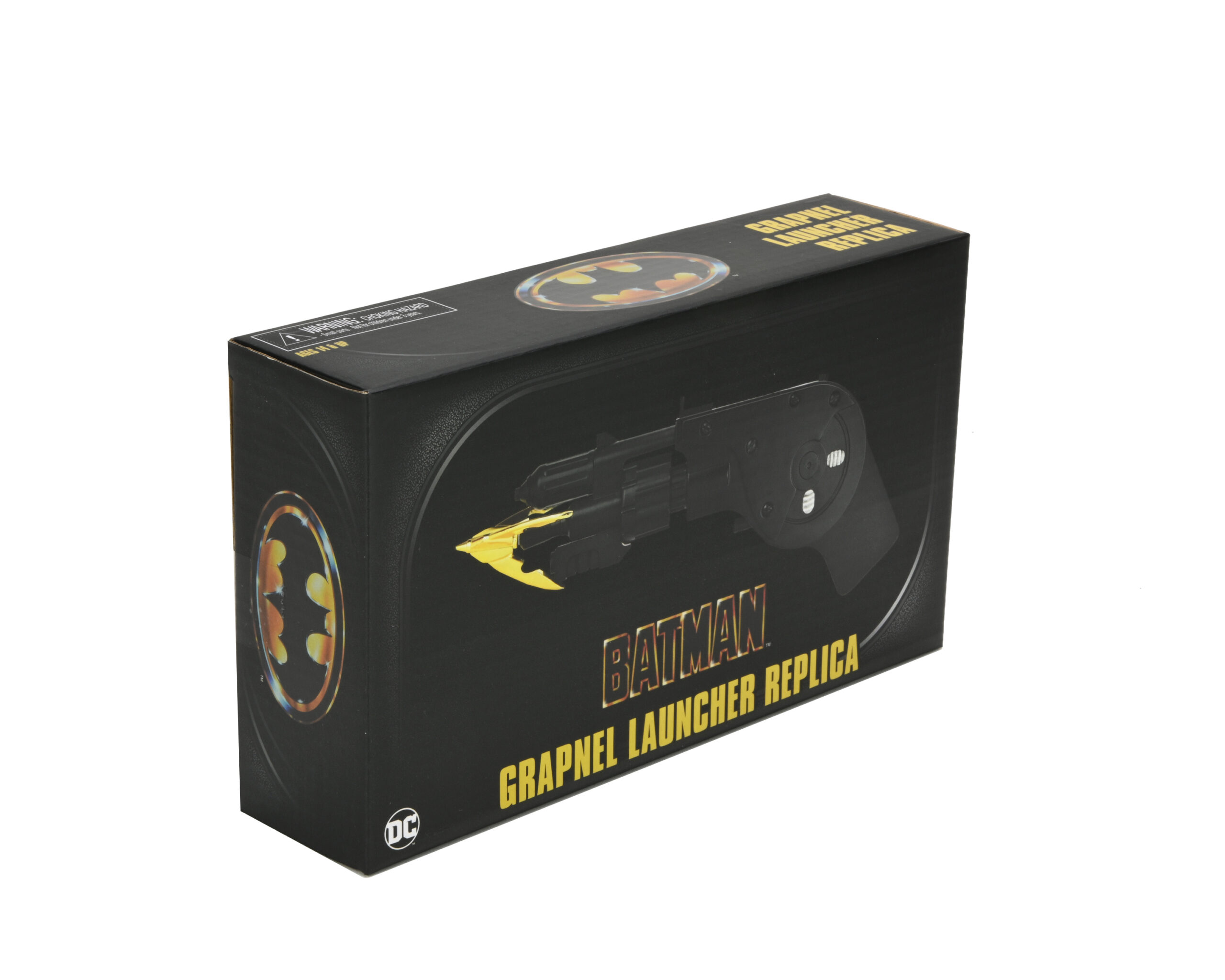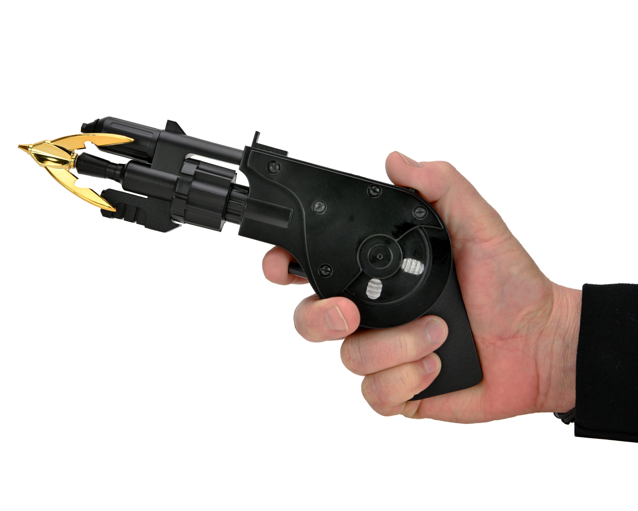 This full-size replica of Batman’s signature gadget, the Grapnel Launcher, is over 7″ in length, with a screen-accurate foldable handle, grapnel hook attachment and a motorized spool that retracts the rope and hook after firing.