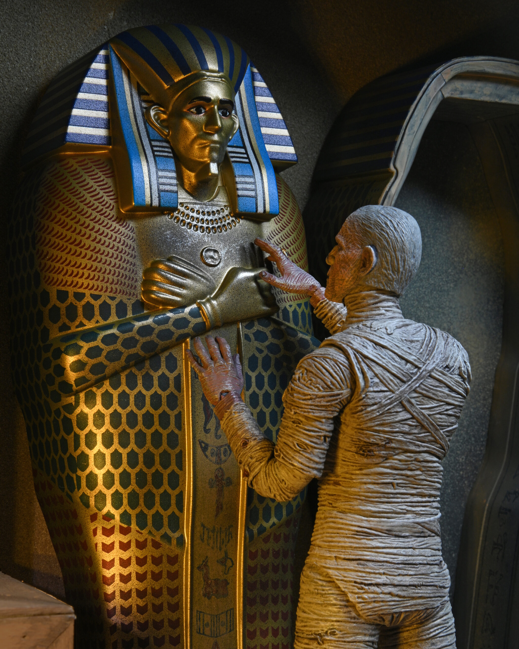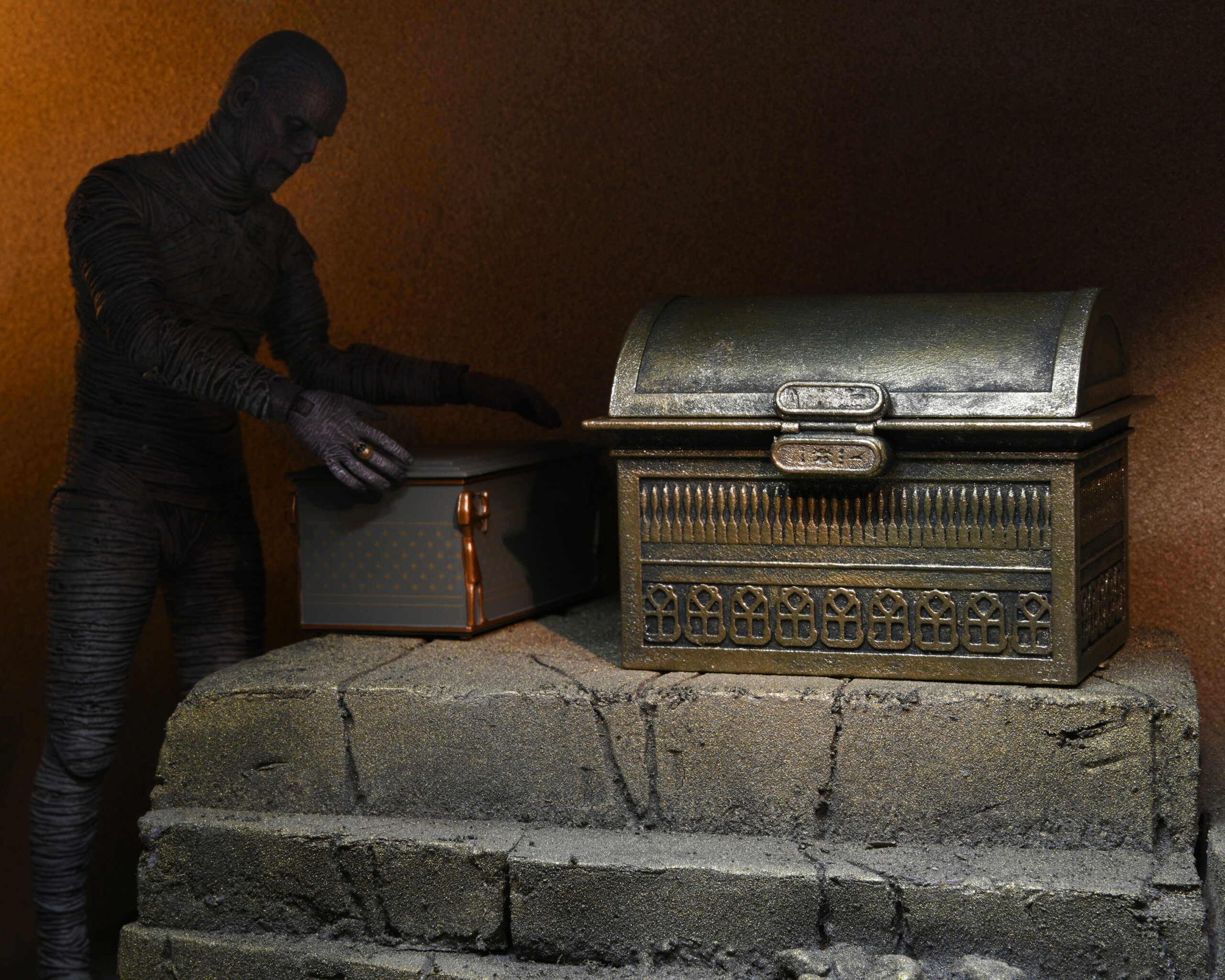 Build even bigger scenes and dioramas with this accessory set for NECA’s Universal Monsters The Mummy action figure! The star of the set is the elaborate sarcophagus, which measures over 9” inches tall and has a removable lid with movie accurate deco and intricate printed pattern. The set also includes a larger opening chest that measures 2.5”x 3”. Both pieces are sized to match NECA’s 7″ scale figure (sold separately). Closed box packaging.