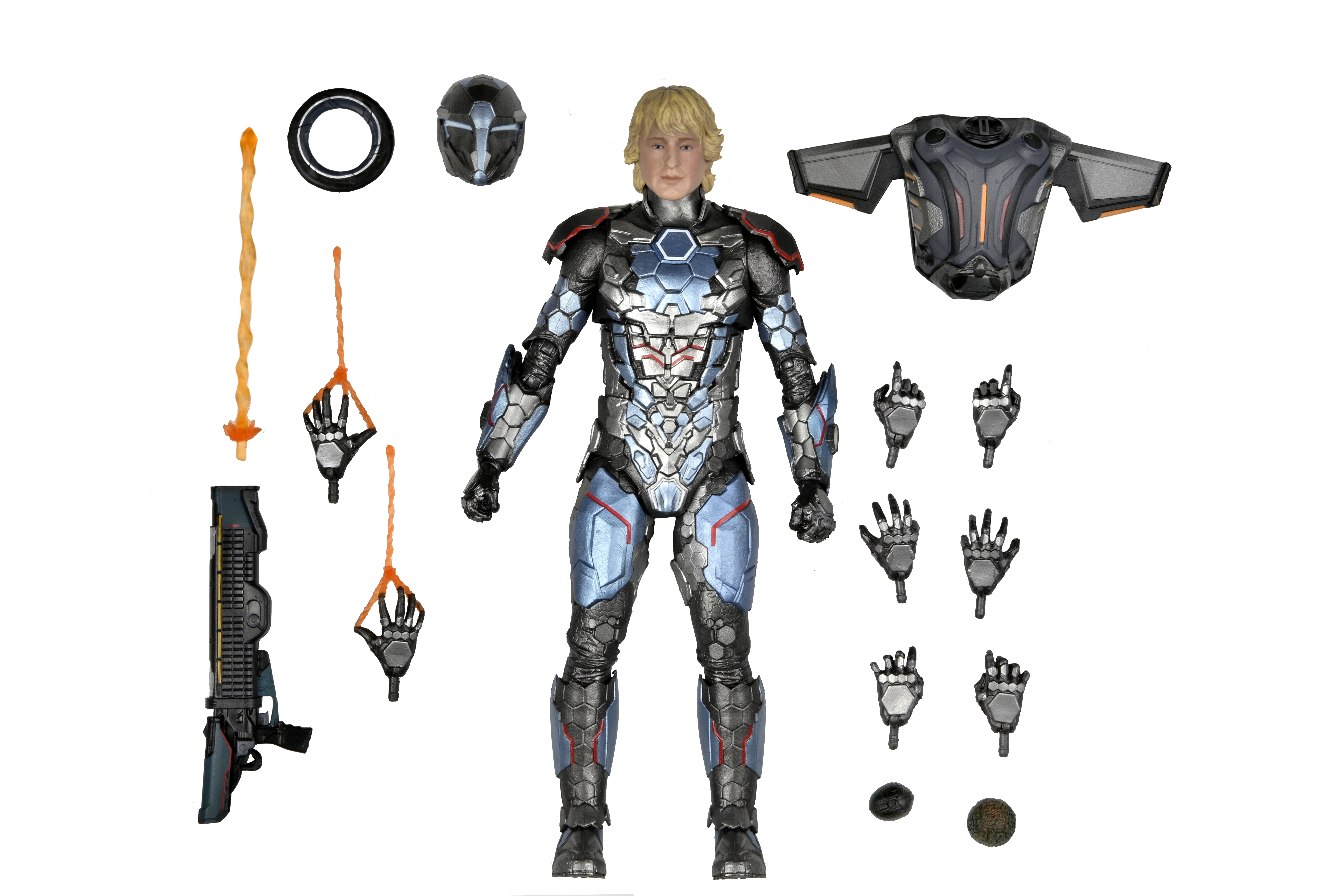 From Secret Headquarters, the new superhero movie coming this August exclusively to Paramount+! Featuring the likenesses of Owen Wilson and Michael Peña, these 7” scale action figures are fully equipped to save the world. The Guard and Argon come with masked and unmasked heads, five sets of interchangeable hands (one with energy effect), attachable jet pack with spring-loaded wings, blaster with attachable blast effect, teleportation disk, nano bomb, and The Source. Window box packaging.