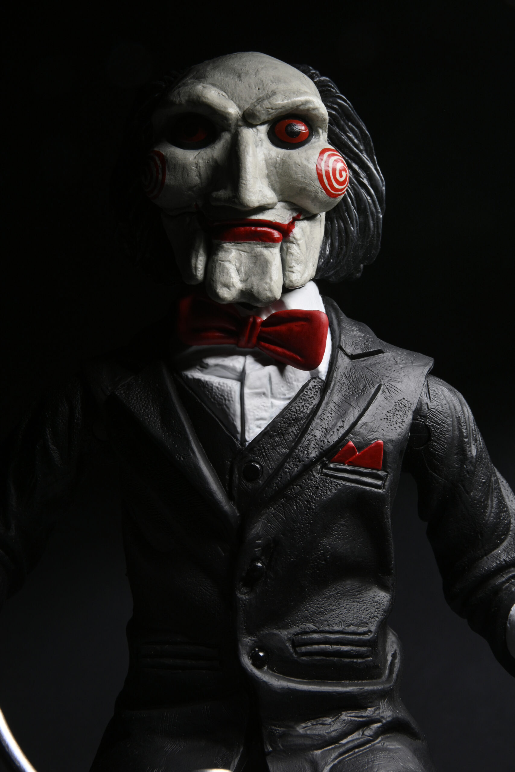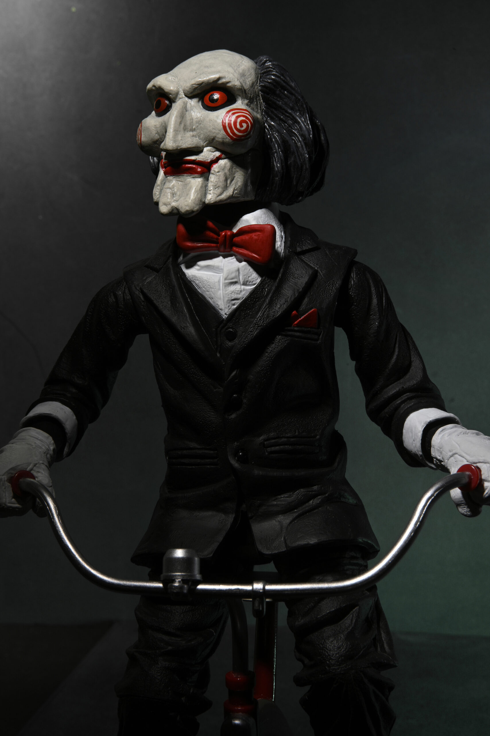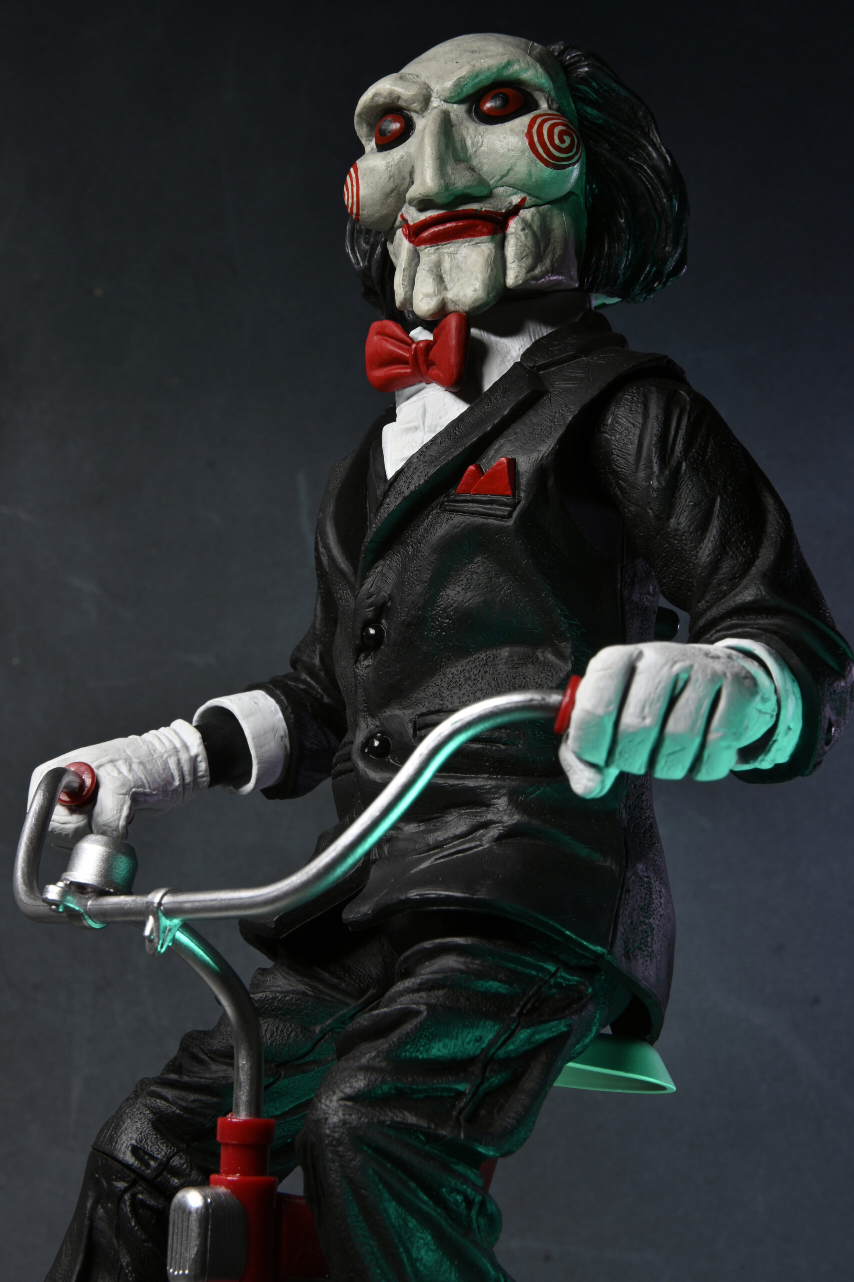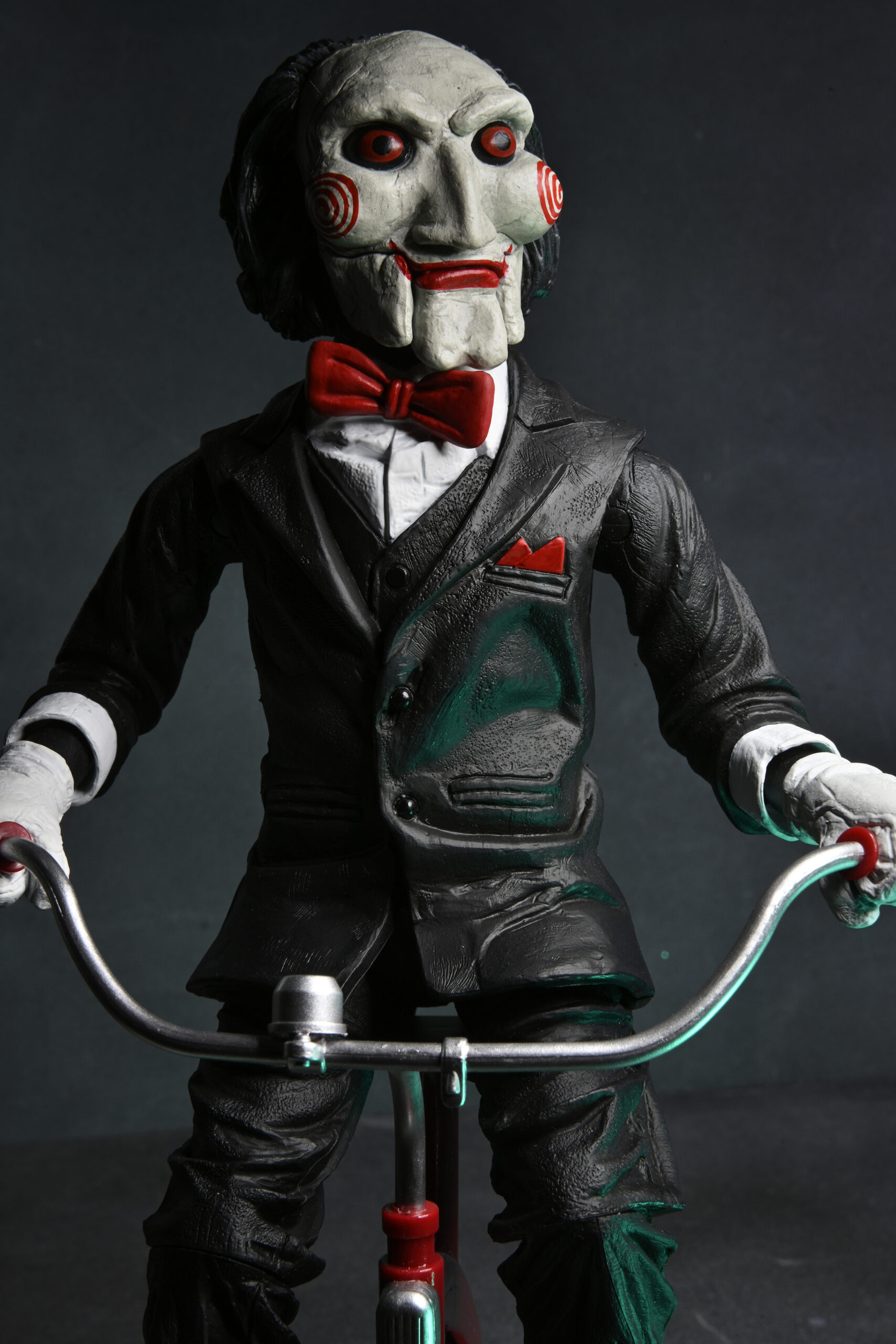 Billy is back! In the Saw movies, The Jigsaw Killer abducts the morally wayward in a twisted attempt to teach his victims the value of life. Once captured, his prisoners must face impossible choices in a horrific game of survival as he communicates with them through an eerie puppet. This 12” action figure of Billy the Puppet on Tricycle features new paint deco and closed box packaging. Press a button to hear sound from the movie! Batteries included.