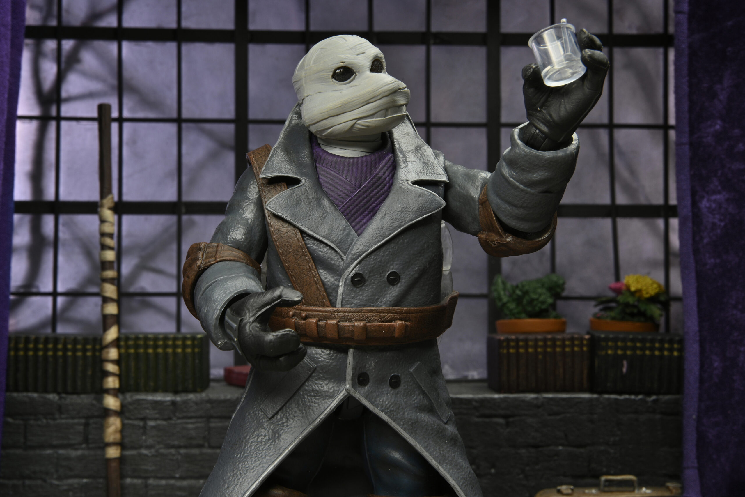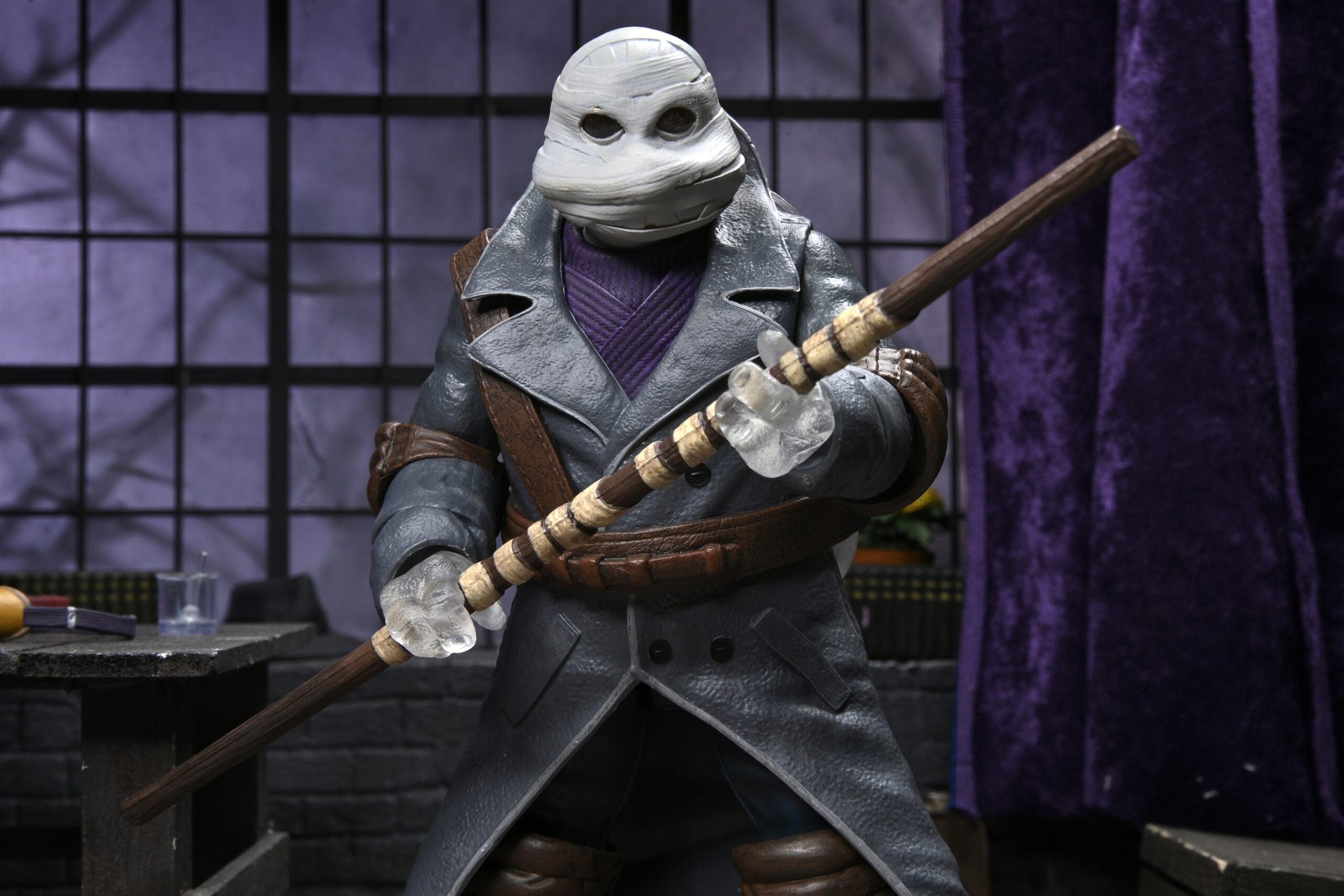 Donatello as The Invisible Man reimagines the Turtle as the mysterious scientist who hides a terrible secret behind his bandages. Explore a descent into insanity with many included accessories: interchangeable heads, hands and feet (including “invisible” hands and feet), microscope, bo staff, TGRI journal, glass, and hat.