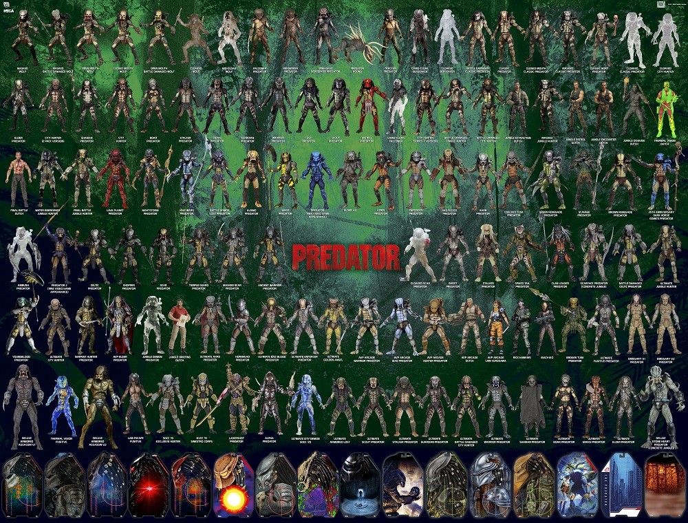 Today’s visual guide is for one NECA’s longest running lines – over 100 Predator figures and counting! There are two different versions of the guide, both showing all figures we have released/announced to date, and one including the updated gallery of card backer art. The Predator Visual Guides are available as extra-large, 300 dpi JPGs. Download links appear below the images!