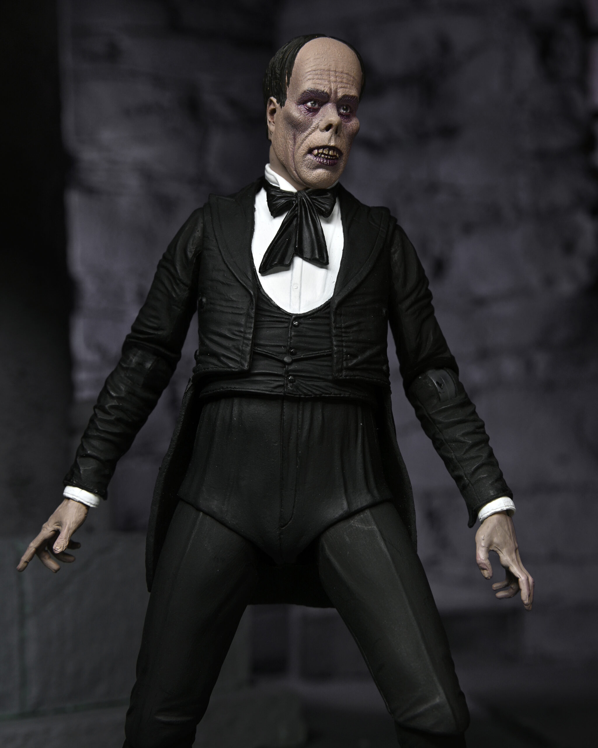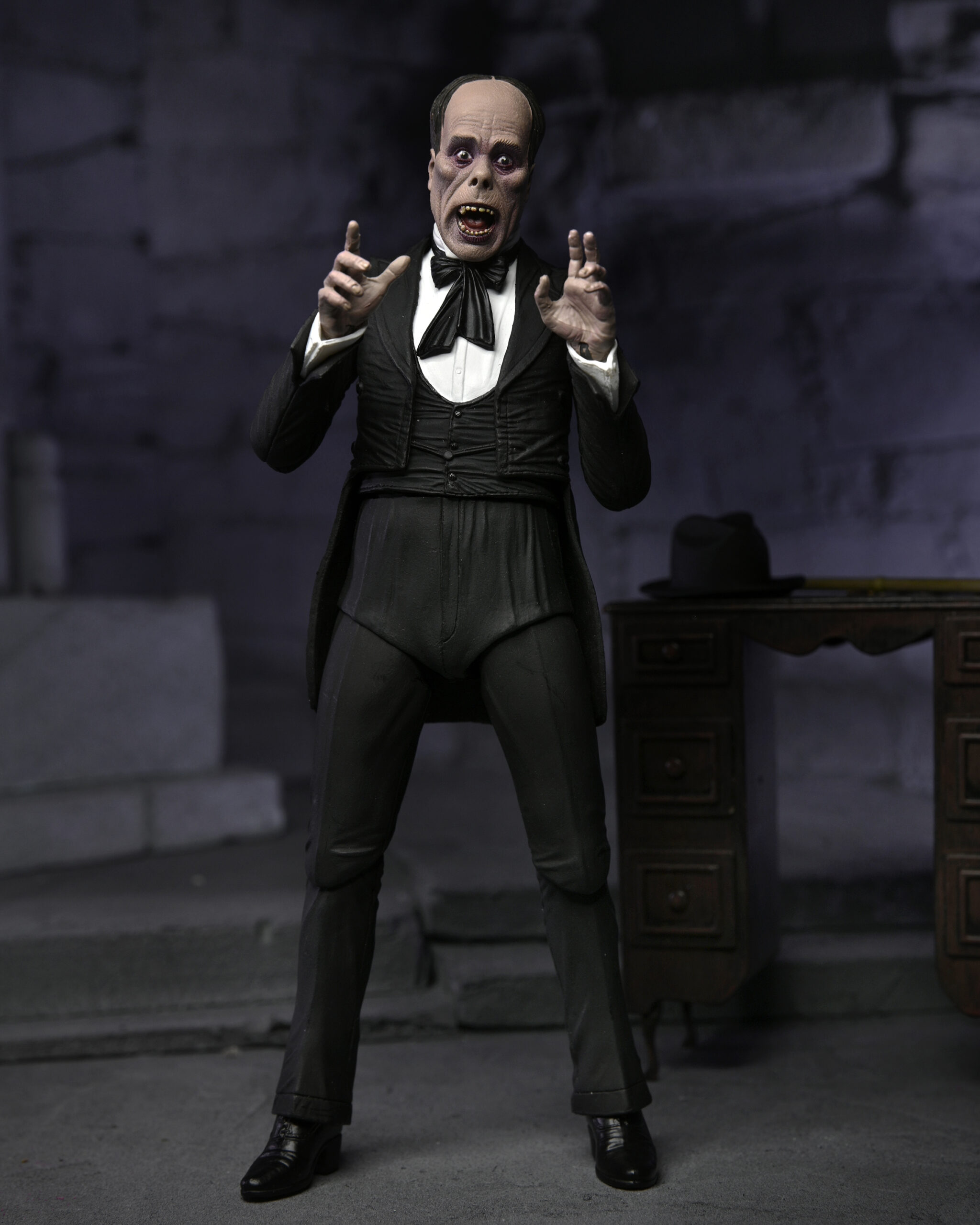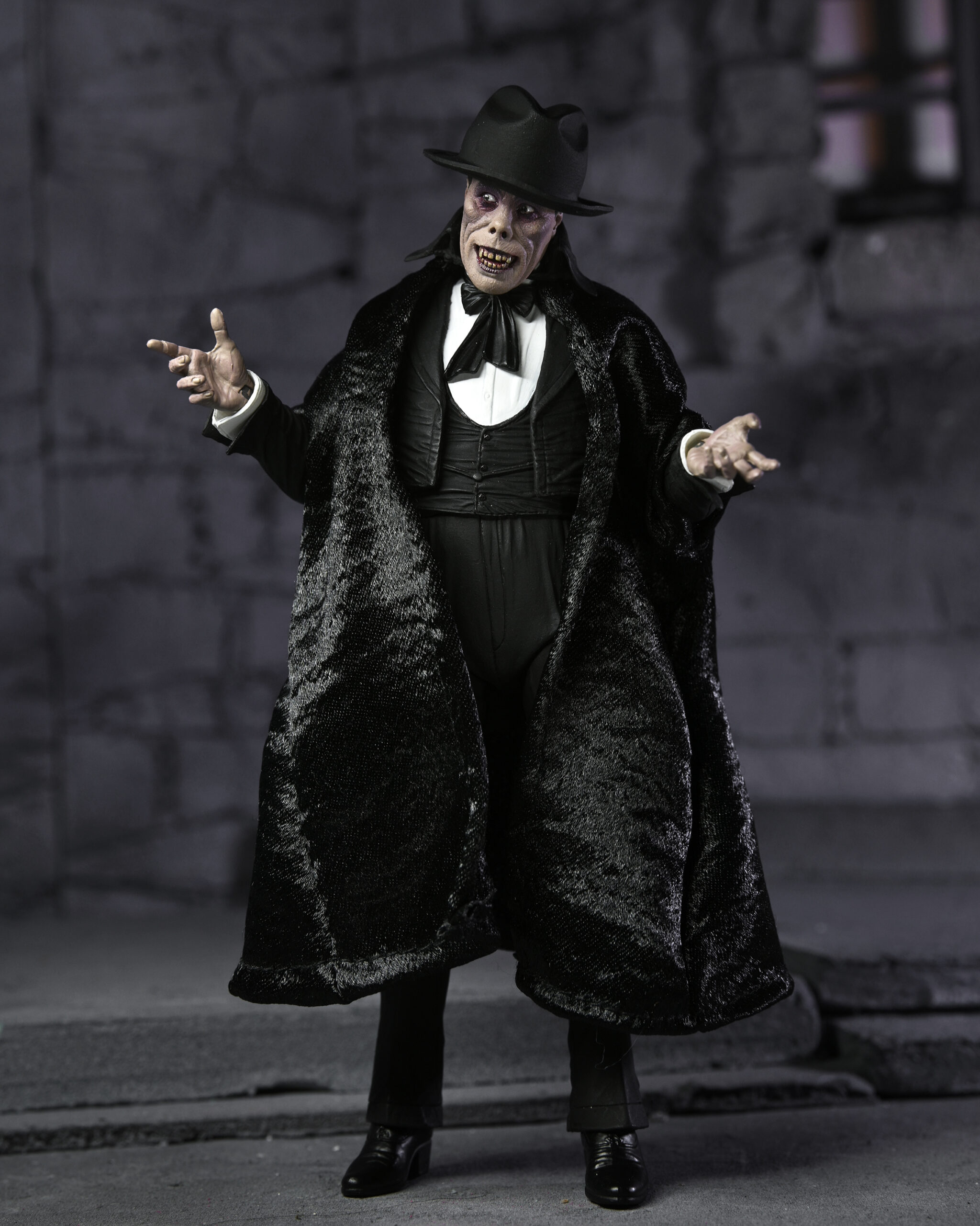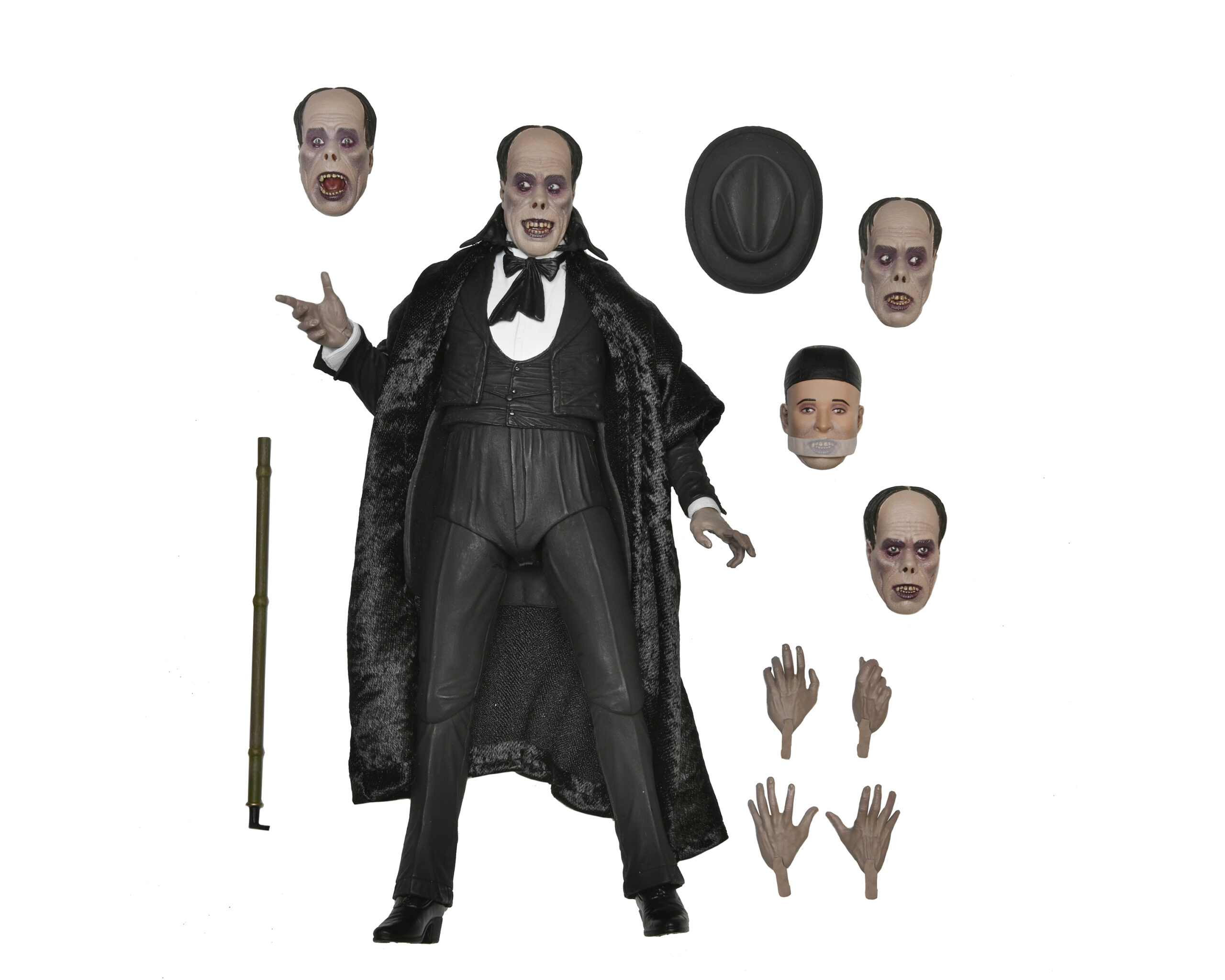Celebrating more horror legends, NECA is excited to reveal The Phantom of the Opera! Starring Lon Chaney, the 1925 silent movie was famed for the shocking appearance of the Phantom, which Chaney created himself and kept secret until the premiere. Almost a century later, the thriller is still critically acclaimed and was added to the United States National Film Registry in 1988 for its historical and cultural significance. The 7” scale figure captures the Phantom both disguised and unmasked with five interchangeable heads, and also includes fabric cloak, bamboo stick and hat accessories. Display-friendly window box packaging with opening front flap.