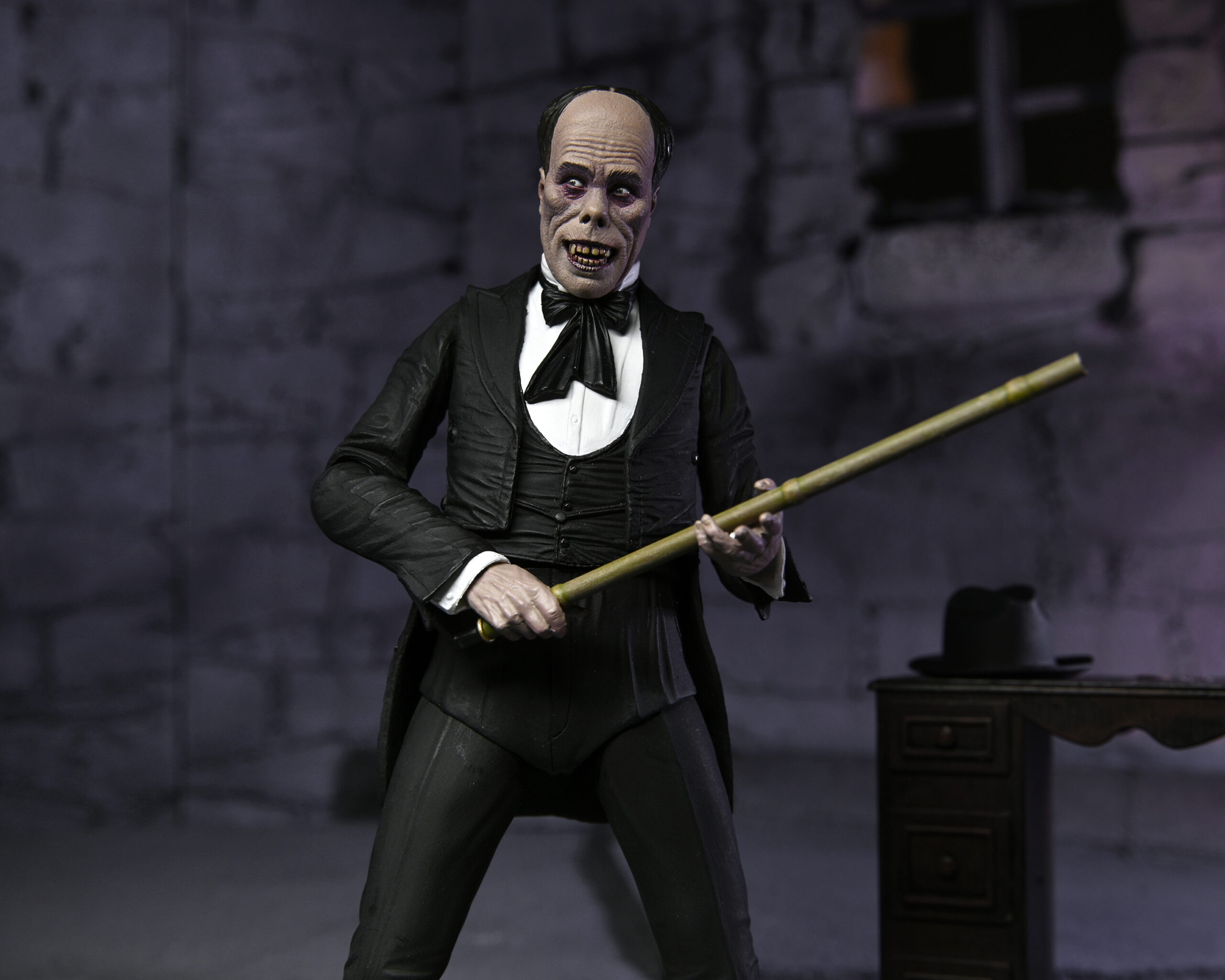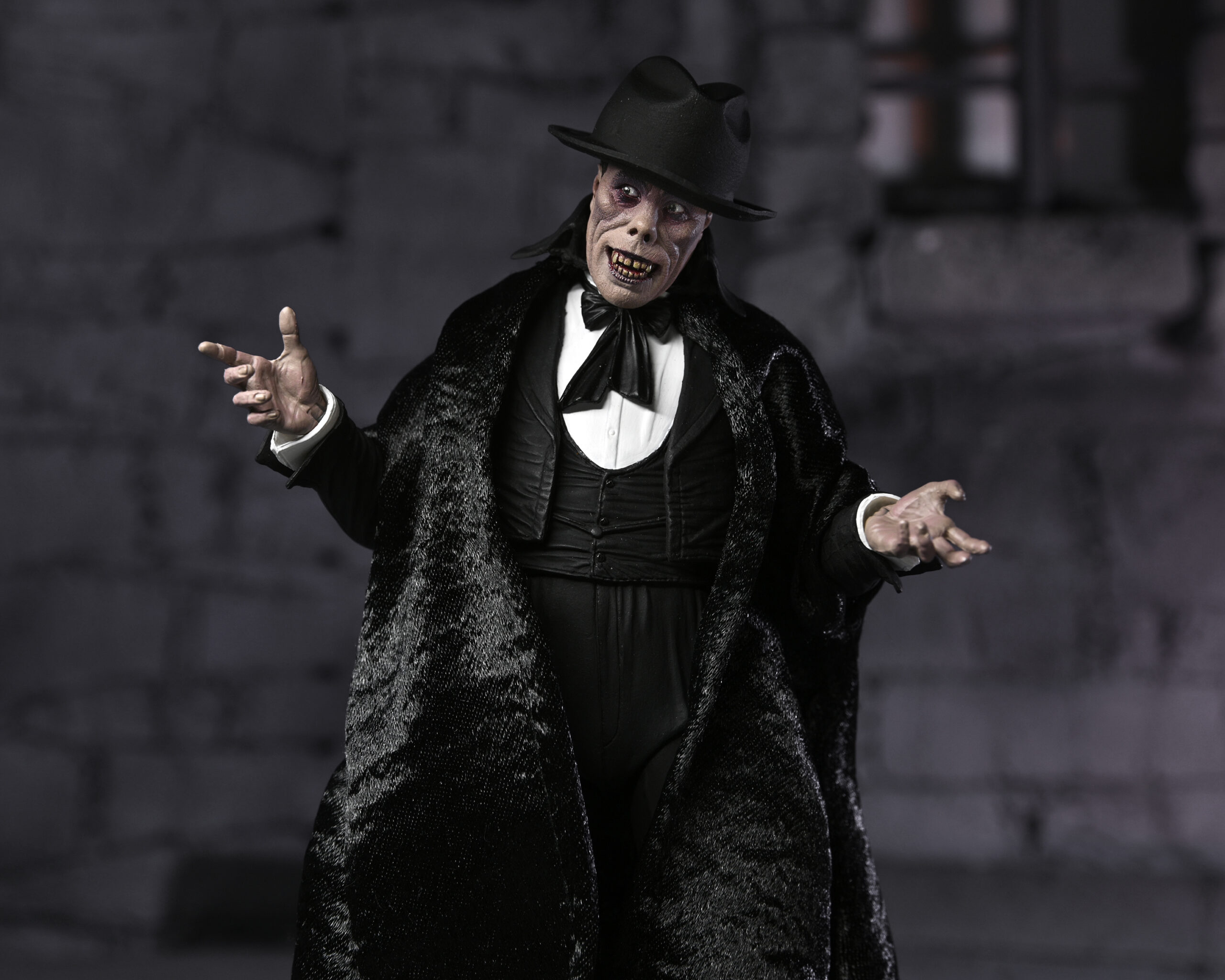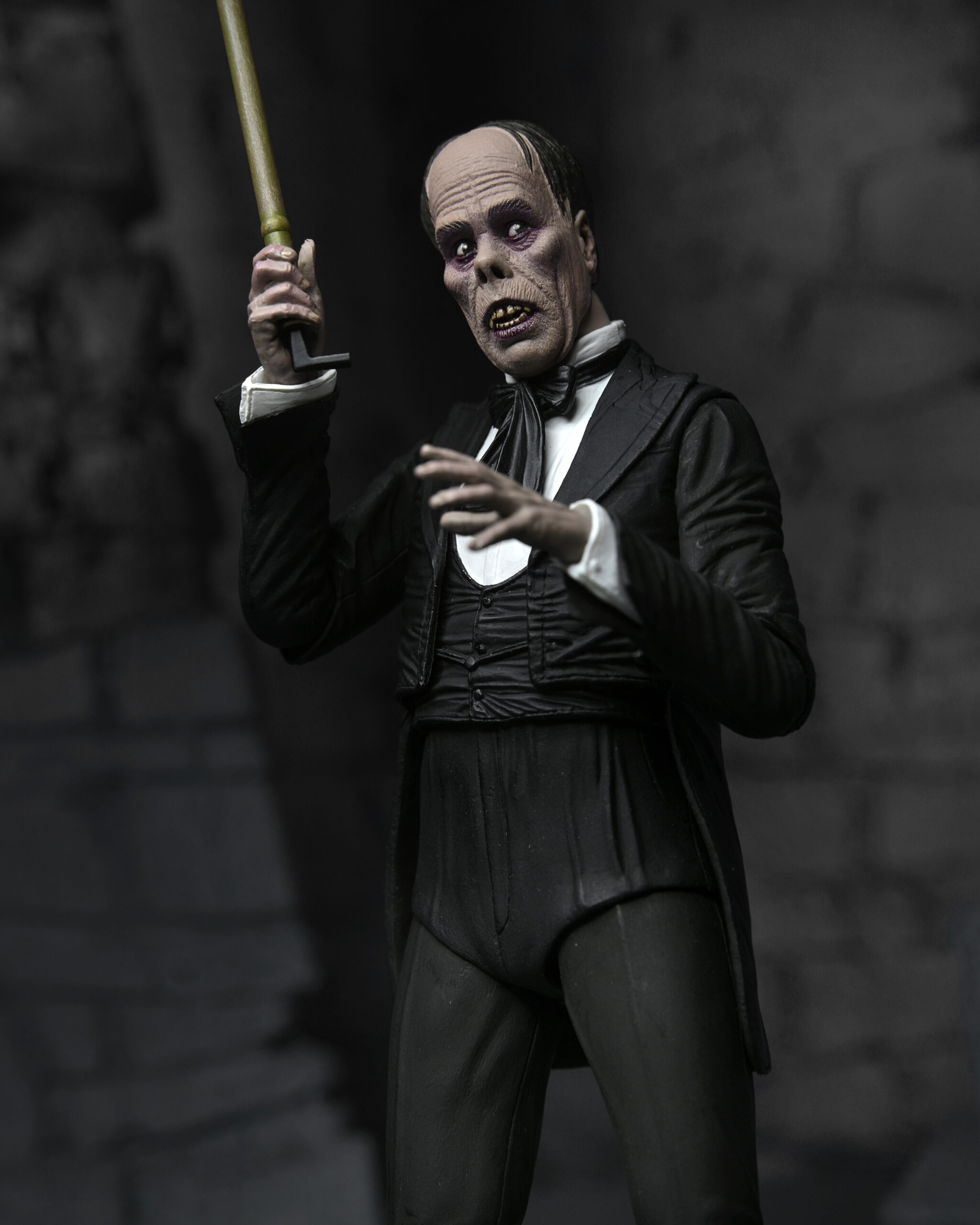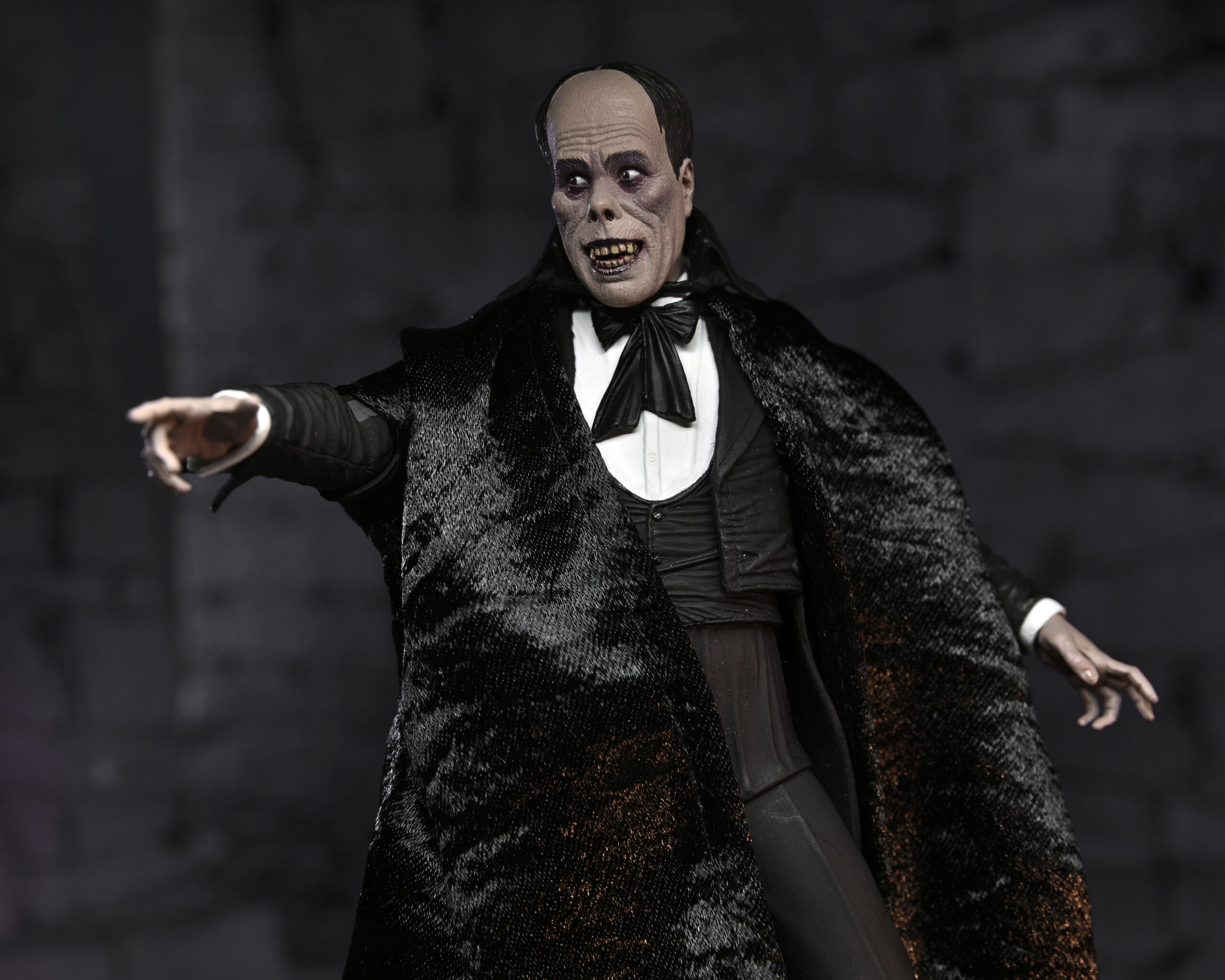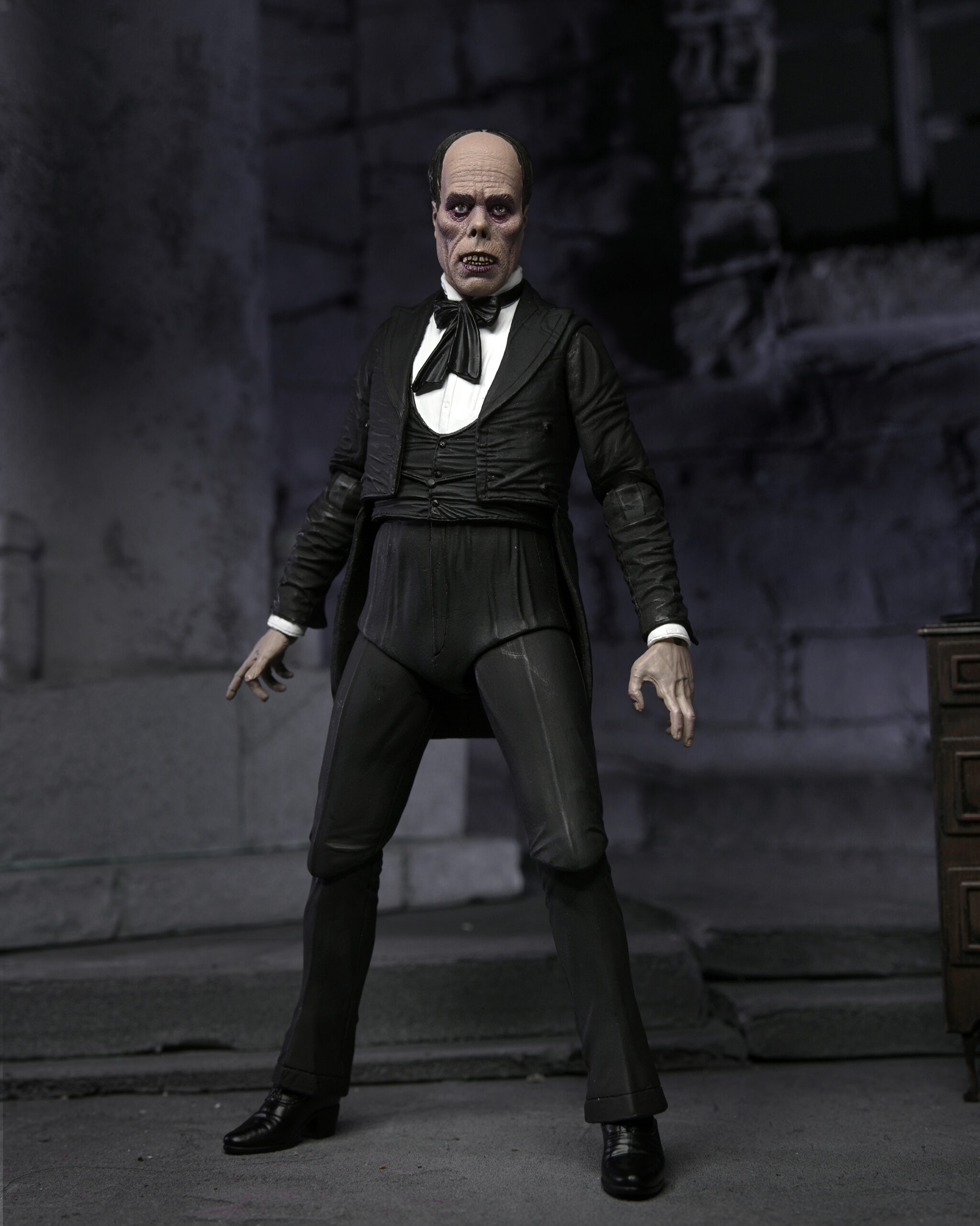 Celebrating more horror legends, NECA is excited to reveal The Phantom of the Opera! Starring Lon Chaney, the 1925 silent movie was famed for the shocking appearance of the Phantom, which Chaney created himself and kept secret until the premiere. Almost a century later, the thriller is still critically acclaimed and was added to the United States National Film Registry in 1988 for its historical and cultural significance. The 7” scale figure captures the Phantom both disguised and unmasked with five interchangeable heads, and also includes fabric cloak, bamboo stick and hat accessories. Display-friendly window box packaging with opening front flap.