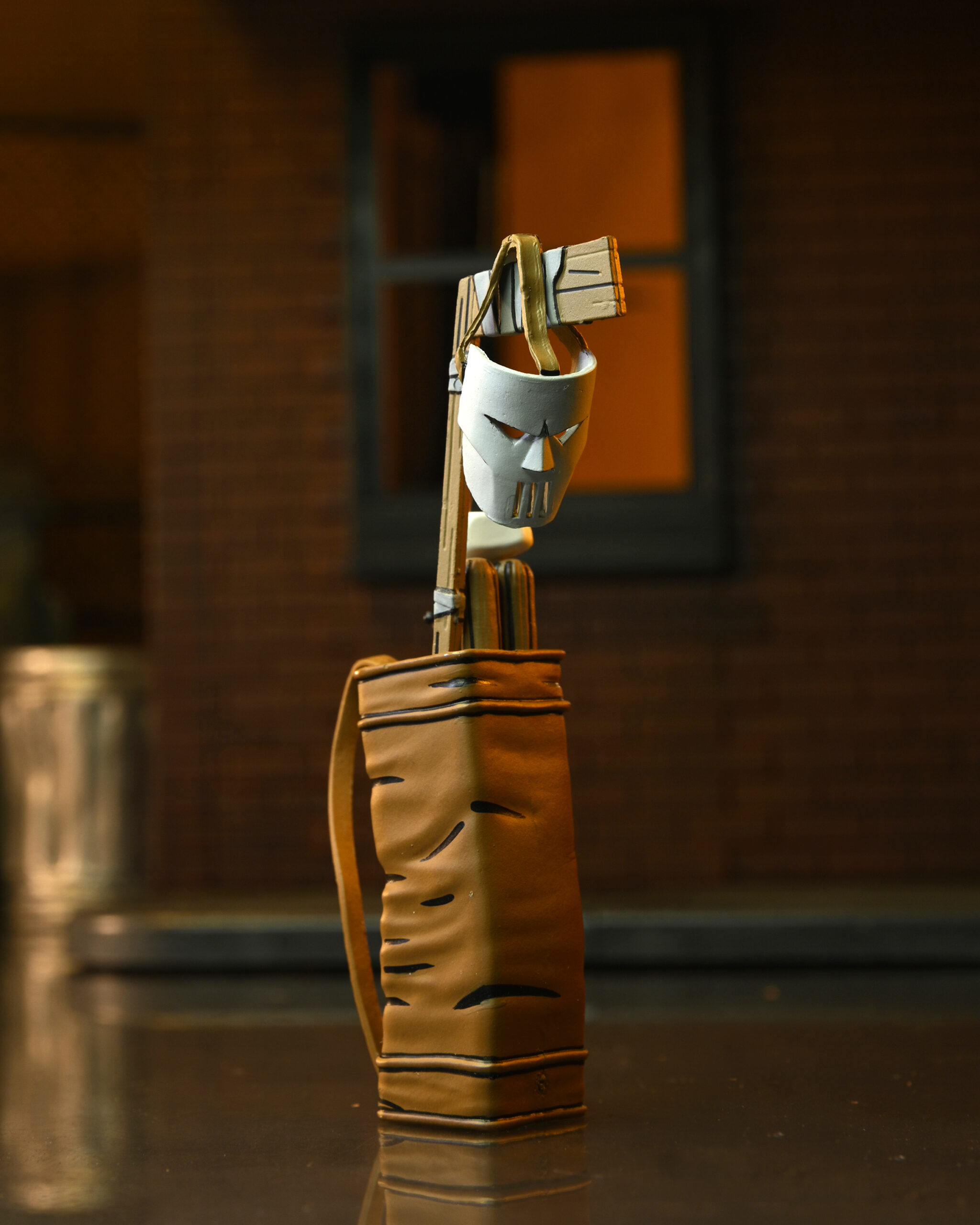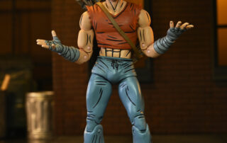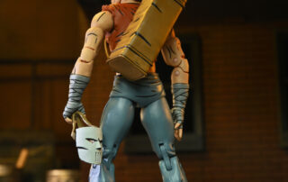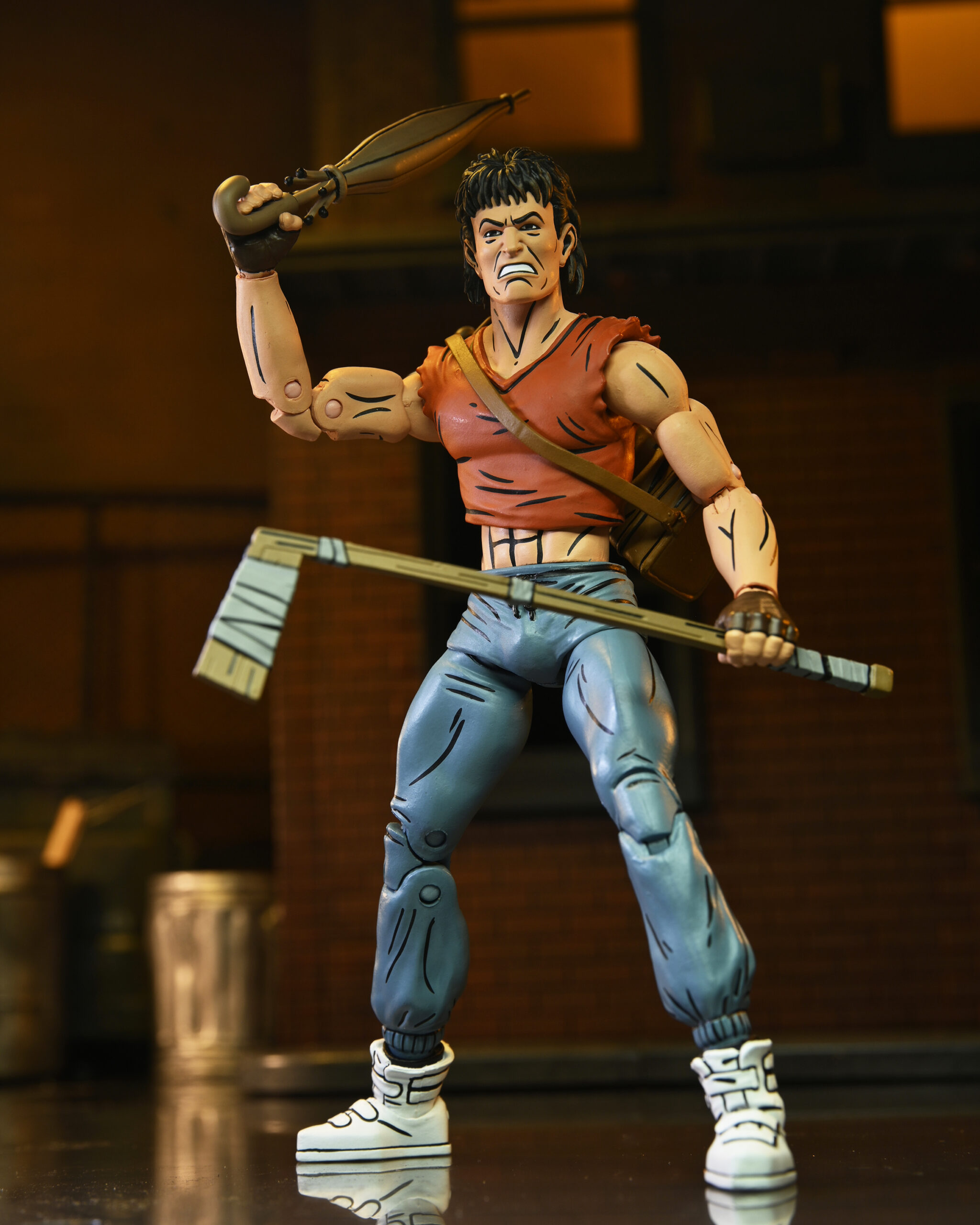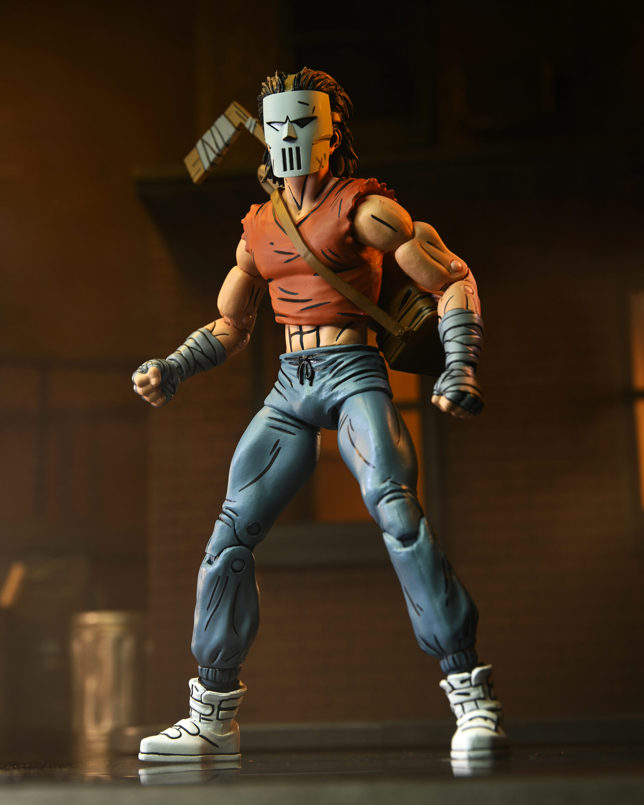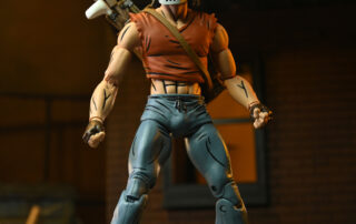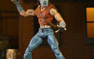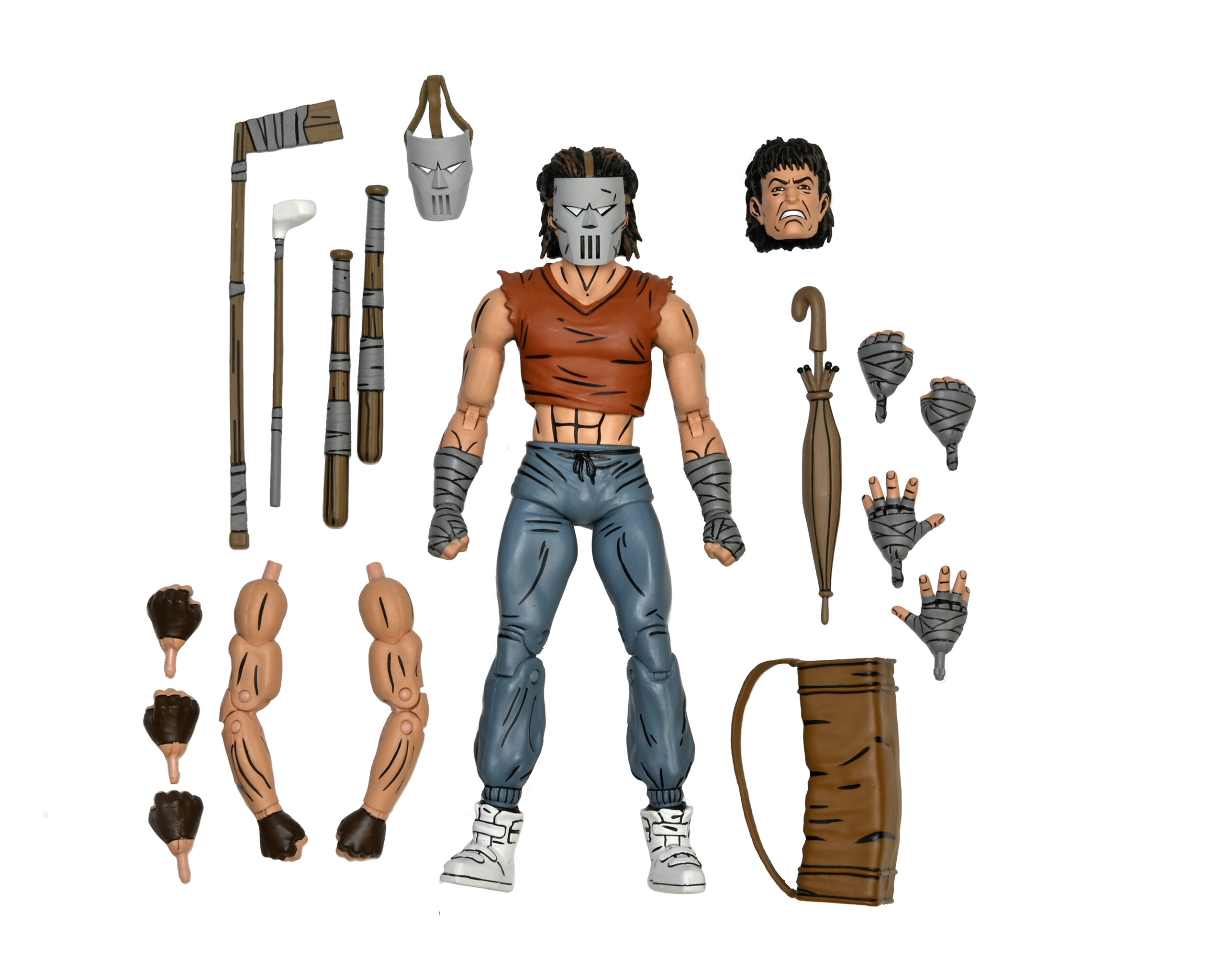 Based on the original Eastman & Laird Teenage Mutant Ninja Turtles comic books from Mirage Studios! Masked vigilante (and sporting goods enthusiast) Casey Jones is on a mission to rid the streets of scumbags by any means necessary. You might think a slightly unstable guy with a golf bag full of “crime-fighting tools” would be a strange ally for the Turtles, but a wise man finds friends in the unlikeliest places! Casey in Red Shirt stands approximately 7″ tall, and includes interchangeable heads and hands, swappable arms (gloved and wrapped versions) plus umbrella, hockey mask, golf bag, bats, hockey stick, and golf club! Comes in special comic-book themed window box packaging illustrated by Kevin Eastman. GOONGALA!