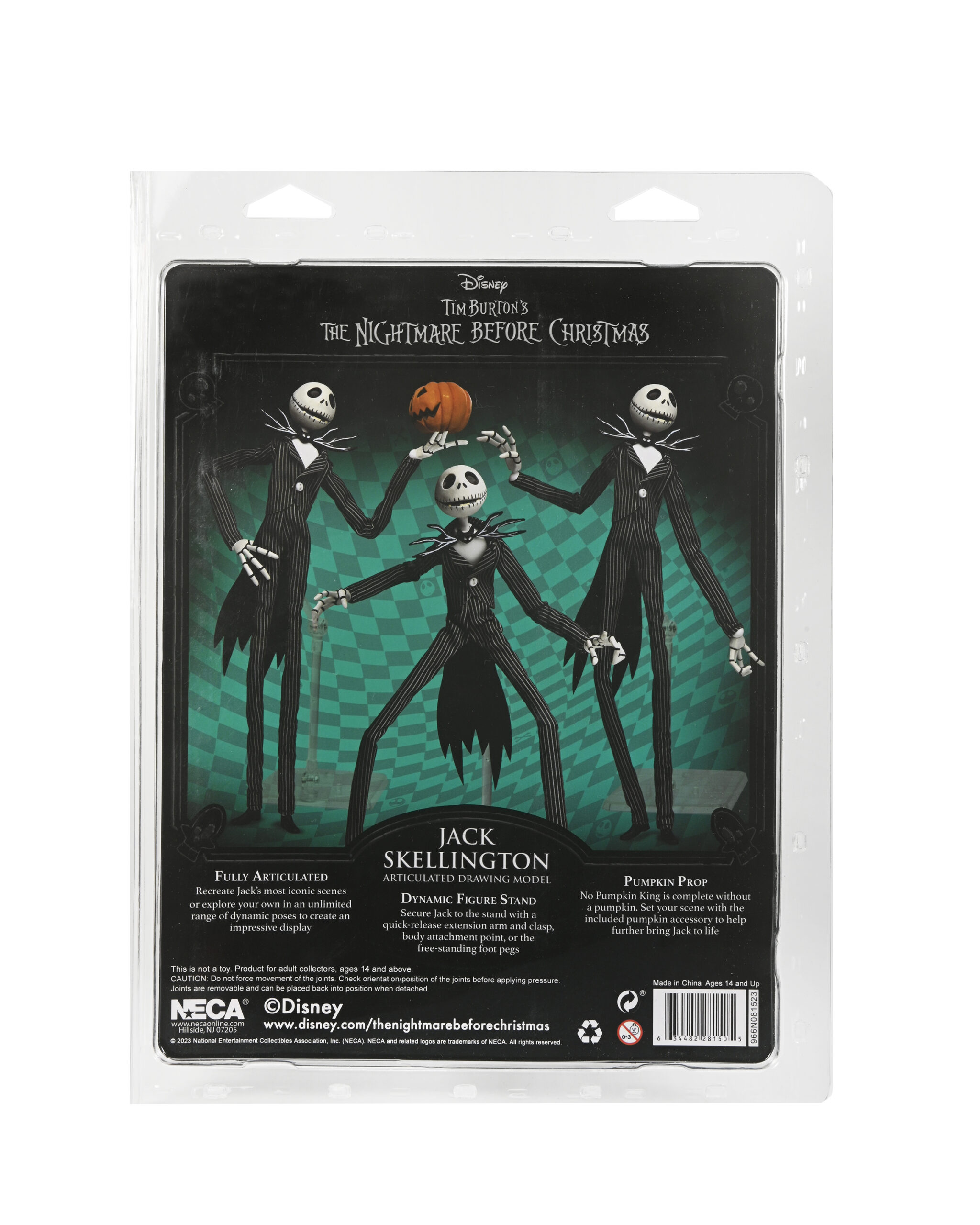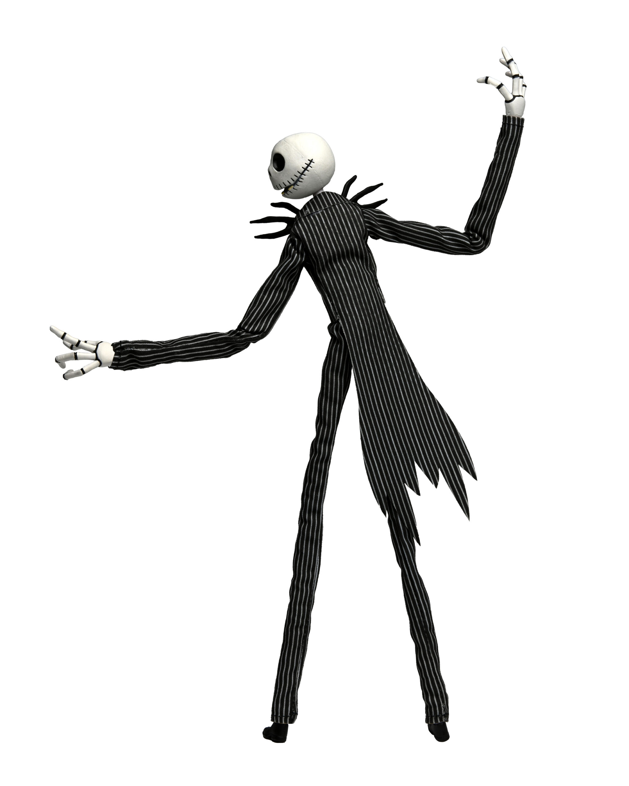 Celebrate the 30th anniversary of Disney’s Tim Burton’s A Nightmare Before Christmas with this new Jack Skellington articulated figure! This frightful fellow is dressed in fabric clothing and stands 9” tall. His fully articulated body has an attachable display stand to let you create a wide variety of delightfully expressive poses and comes with a pumpkin accessory. Resealable clamshell packaging.